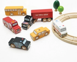 Vozila so etično izdelana iz FSC certificiranega lesa in ročno dodelana z okolju prijaznimi barvami. Zaradi združljivosti s priljubljenimi lesenimi progami boste otrokov svet zlahka razširili z dodatnimi elementi in potmi. Komplet je zasnovan tako, da prenese vsakodnevno igro in podpira kognitivne veščine.