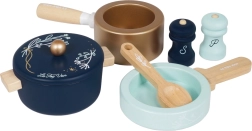 Lonec s pokrovko, kozica, ponev in leseni dodatki spodbujajo domiselno igro in posnemanje pravega kuhanja.