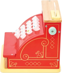 Vesela rdeča barva z zlatimi elementi in veliki gumbi naredijo blagajno privlačen kos za vsako otroško trgovinico.