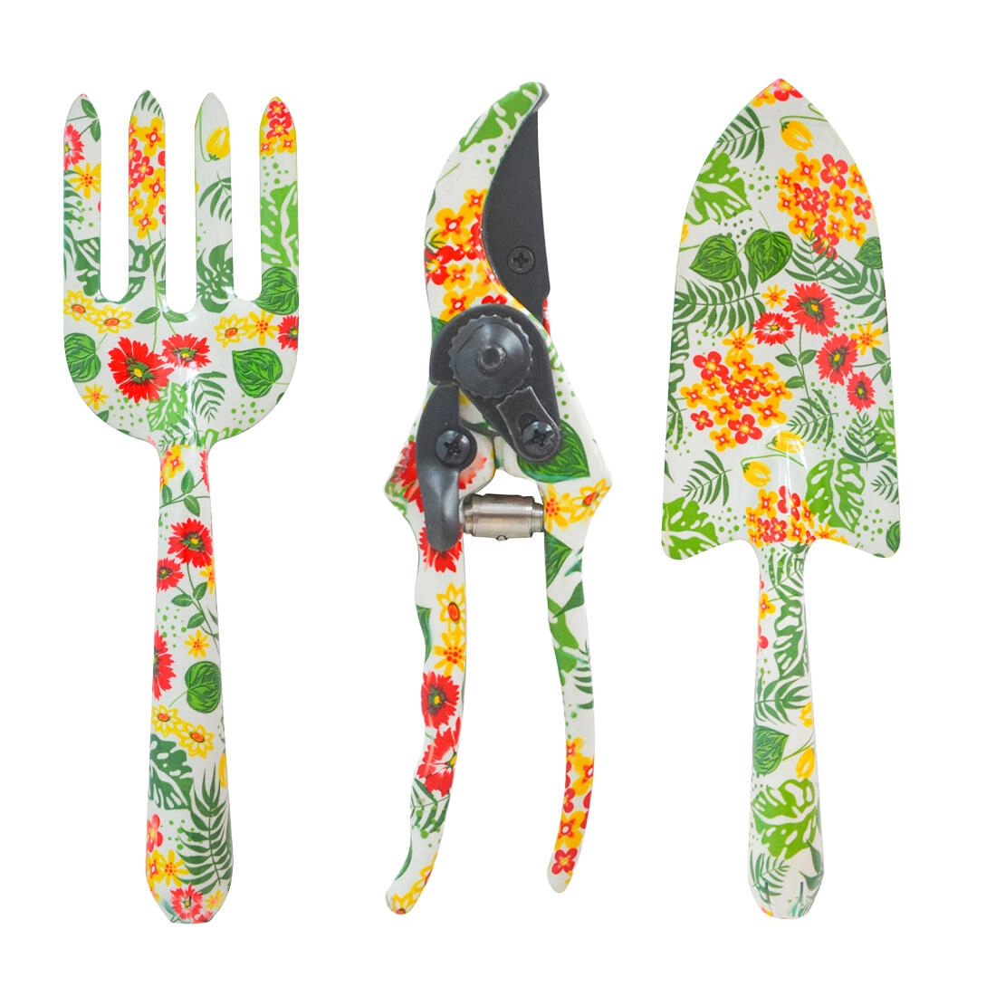 V pakiranju najdete rahljalnik tal za rahljanje, sajenje in pletje, ročni lopatnik za presajanje in delo s substratom ter vrtne škarje za natančno obrezovanje rastlin. Kakovostni železni in aluminijasti materiali zagotavljajo trpežnost in dolgo življenjsko dobo.