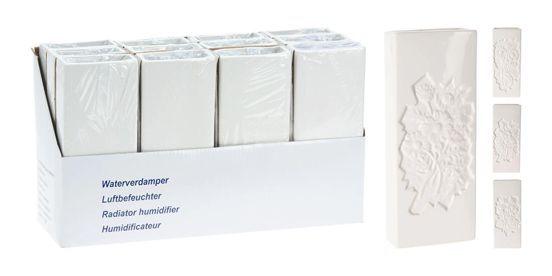 Eleganten keramični uparjalnik za radiator z vtisnjenim cvetličnim reliefom naravno vlaži zrak v suhih prostorih. S priročnim kavljem ga zlahka obesite na večino radiatorjev. Kompaktne mere 20,5 × 8 × 3,5 cm prihranijo prostor, bela barva pa se poda vsakemu interierju.