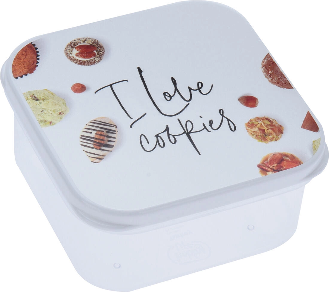 Stilen set štirih kvadratnih posod z pokrovi za vsakodnevno shranjevanje živil. Zahvaljujoč tesnilnim pokrovom, praktičnim velikostim in zložljivi obliki ostane vse sveže in pregledno. Posode so izdelane iz plastica brez BPA in jih krasijo igrivi motivi sadja, zelenjave, makronov in piškotov.