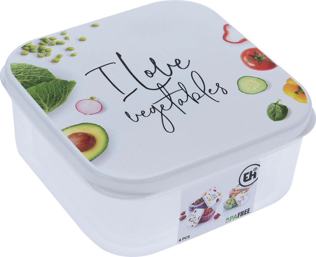 Set kvadratnih posod za živila s potiskom, 4 kosi (0,3 l + 0,45 l + 0,65 l + 1 l)