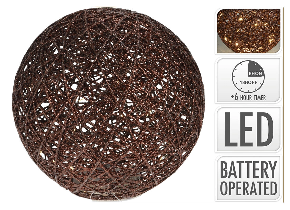 Ta stilska kovinska krogla z vgrajeno LED osvetlitvijo je idealna za praznično okrasitev notranjih prostorov. Zaradi rjave površine in nežne svetlobe ustvarja toplo in slovesno vzdušje v vsakem prostoru. Praktični časovnik poskrbi, da se dekoracija prižge vsak dan ob istem času brez potrebe po ročnem vklapljanju.