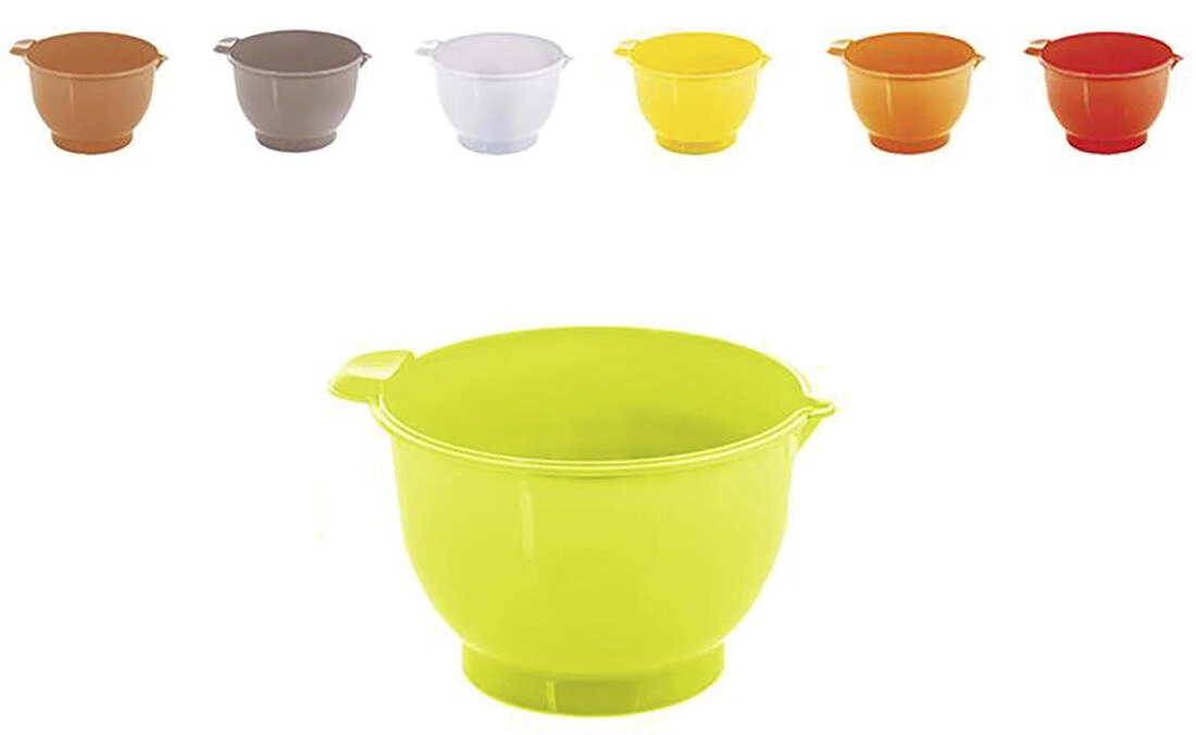 Praktična mešalna posoda s prostornino 3 l iz trpežne plastike z protizdrsnim gumijastim dnom za stabilnost pri delu. Opremljena je z izlivom za enostavno prelivanje in je idealna za stepanje krem in snega. Dobavljiva v mešanici barv.