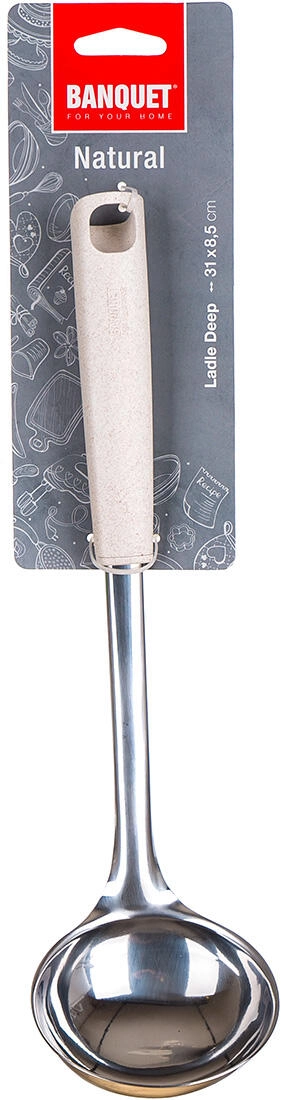 Zajemalka NATURAL je zasnovana za vsakodnevno zanesljivo uporabo v gastronomiji in doma. Globoka nerjaveča glavica omogoča udobno zajemanje juh in omak, medtem ko lahek in prijeten ročaj iz polipropilena z dodatkom pšeničnih otrobov zagotavlja varen oprijem.
