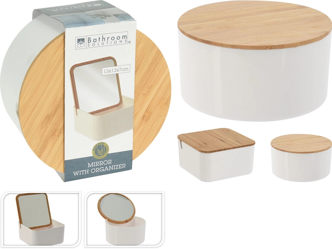 Eleganten organizer za drobnarije z nagibnim ogledalcem združuje čist bel plast in naravni bambus. Idealno za kopalnico in toaletno mizico, ponuja kompaktne mere, praktično ogledalce in sodoben minimalističen dizajn v dveh oblikah – okrogli in kvadratni.