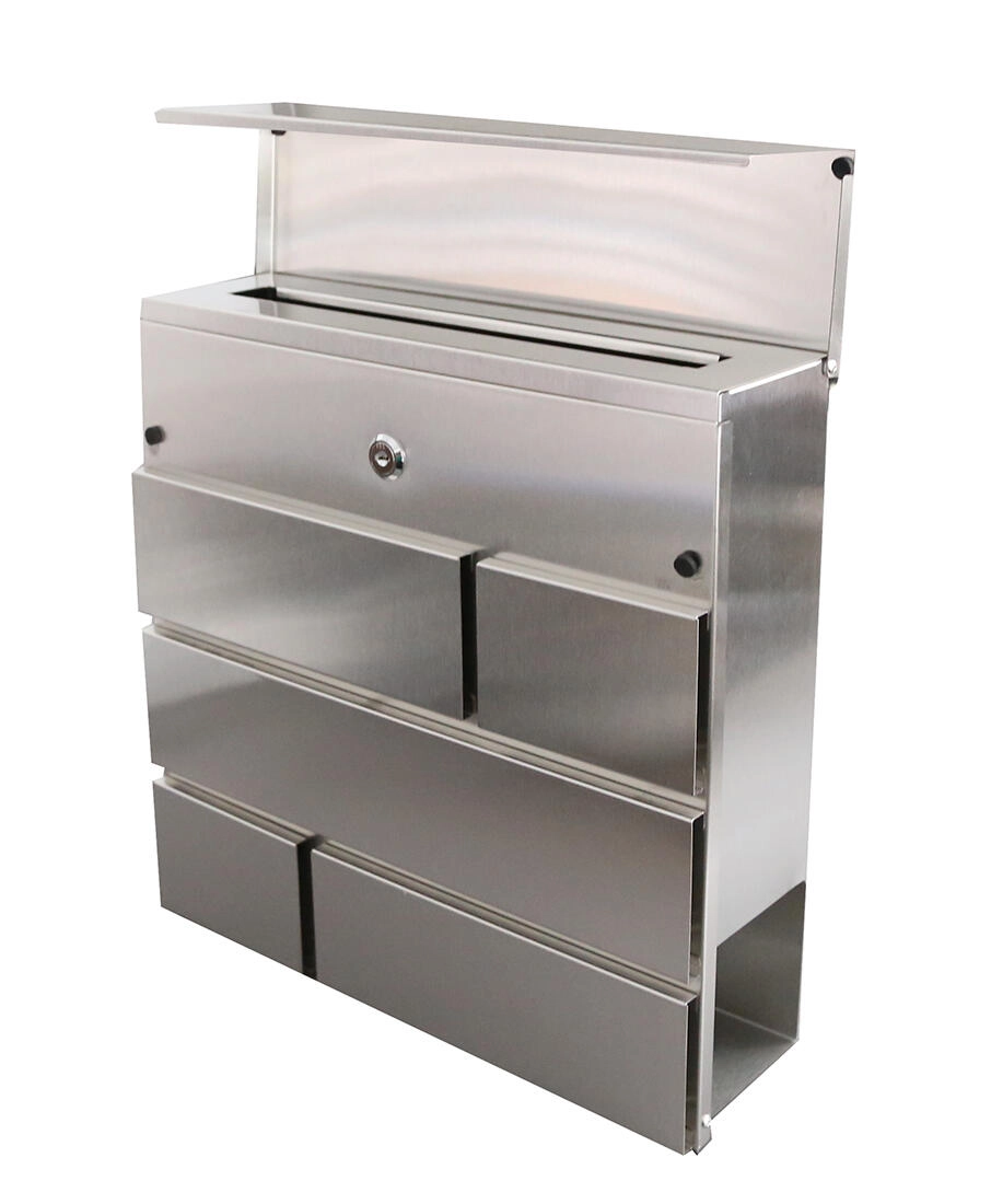 Eleganten in trpežen poštni nabiralnik BRICKS iz nerjavnega jekla tipa 201 je idealna izbira za družinske hiše in podjetja. Zahvaljujoč zgornjemu vnosu je pošta zaščitena pred vremenskimi vplivi, vratca na ključ s cilindrično ključavnico pa zagotavljajo varno prevzemanje.