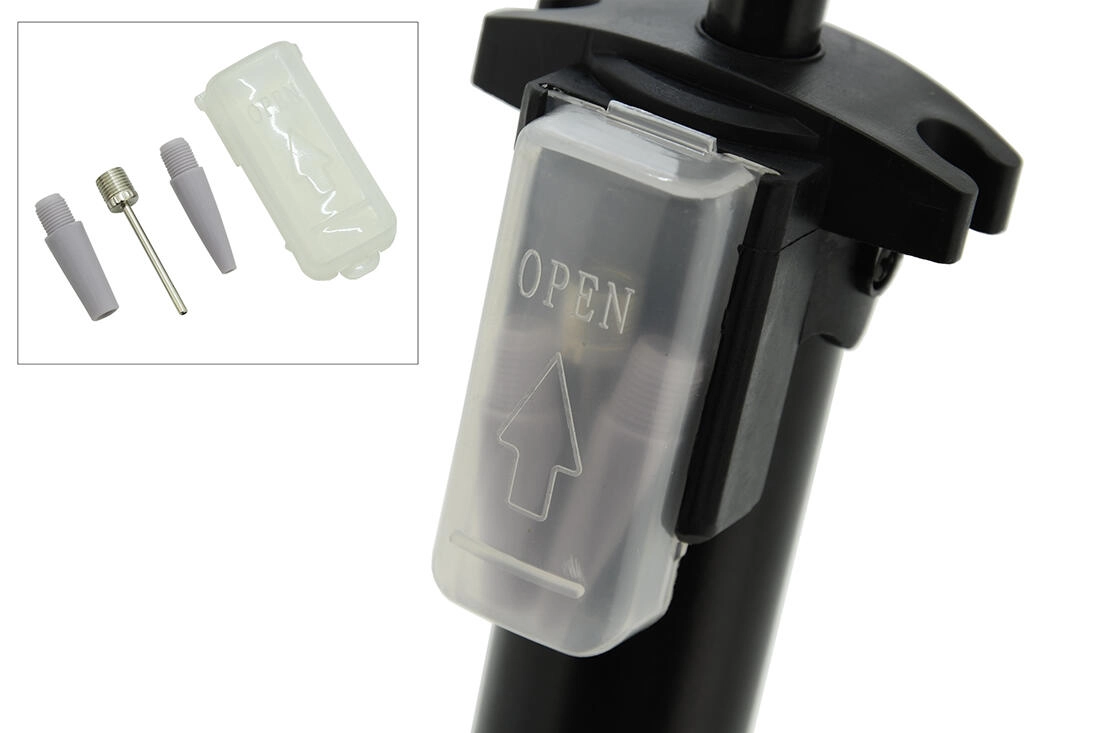 Praktična ročna tlačilka z integriranim manometrom za natančno polnjenje pnevmatik avtomobilov in koles. Zahvaljujoč dvojnemu adapterju ustreza avto in Presta ventilom, ponuja predalček z nastavki za žoge in blazine, udobno uporabo pa zagotavljata nožno naslonjalo in ergonomski ročaj.