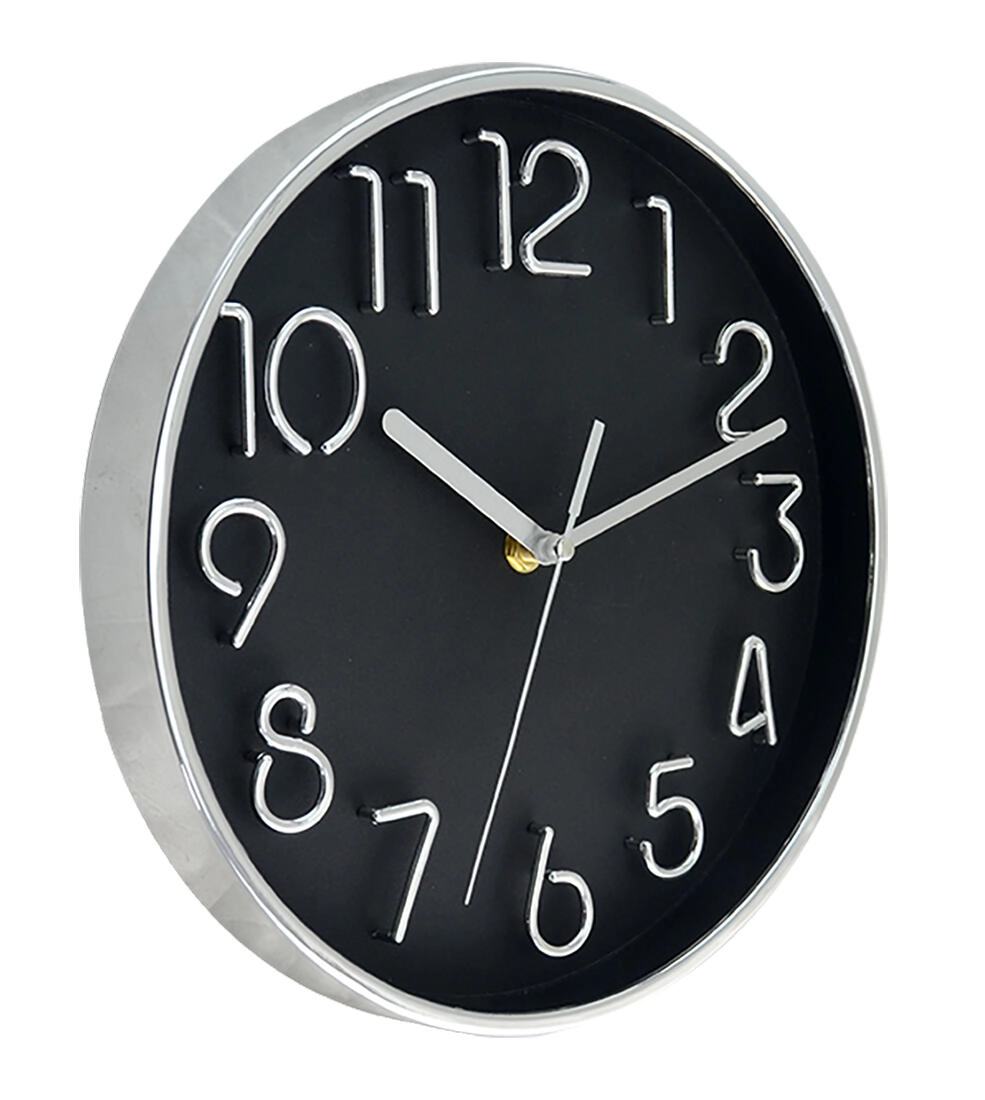 Te stenske ure v elegantni srebrno‑črni kombinaciji dodajo vašemu domu ali pisarni sodoben poudarek. Premer 30 cm je idealen za enostavno berljivost, medtem ko kakovostno steklo ščiti številčnico, kovinski okvir pa poudari premium videz. Zaradi tihega teka vas ne bo motilo neprijetno tikanje.