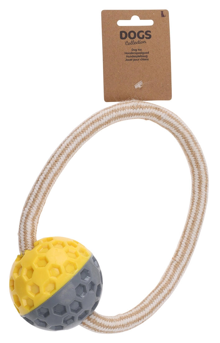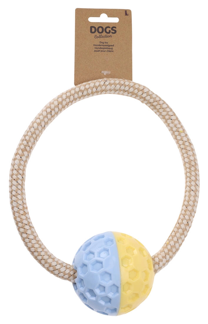 Ta trpežna pasja igrača združuje močno bombažno vrv in dvobarvno TPR žogico z izrazito teksturo za boljšo masažo dlesni. Odlična je za aktivno igro na prostem in doma, podpira naravni nagon po lovu ter krepi vez med psom in lastnikom.