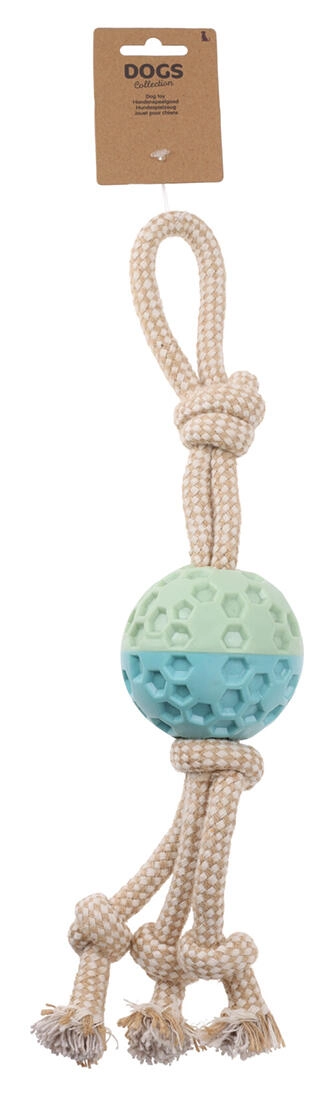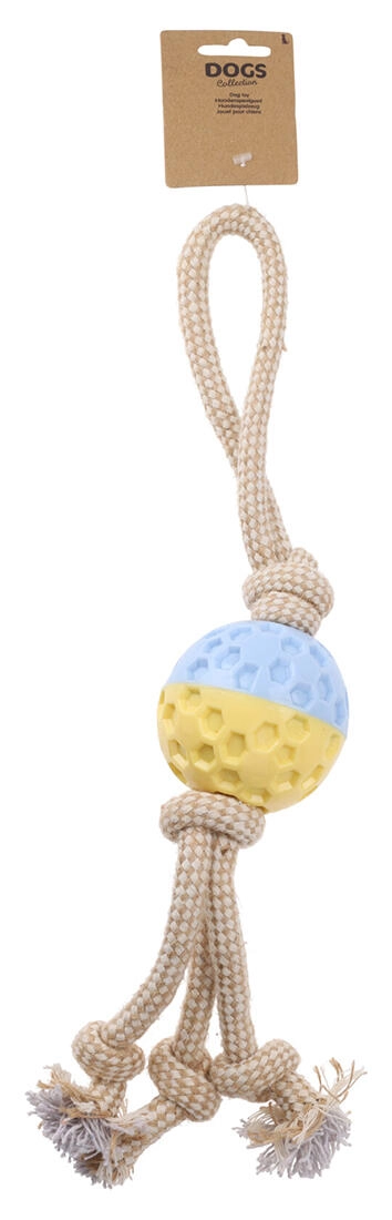 Teksturirana TPR žogica je prožna in prijazna do zob, medtem ko močna bombažna vrv zdrži intenzivno vlečenje in pogosto igro.