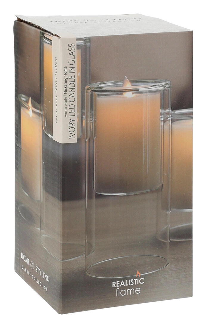 Ta stilska LED sveča s premerom 10 cm in višino 20 cm je skrita v čvrstem steklenem ohišju, ki poudarja njen eleganten videz. Nežen odtenek ivory deluje univerzalno in se zlahka kombinira z vsakim interierjem.