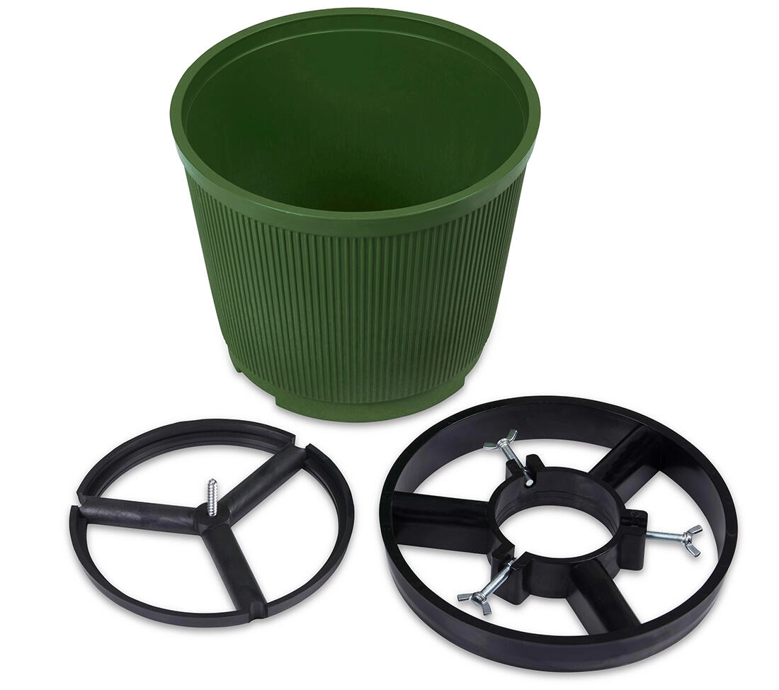Odstranljiv plastični element olajša čiščenje in rokovanje. Za še večjo stabilnost lahko osnovo napolnite s peskom in vodo. Stojalo je primerno za širok nabor debel zaradi velike montažne odprtine.