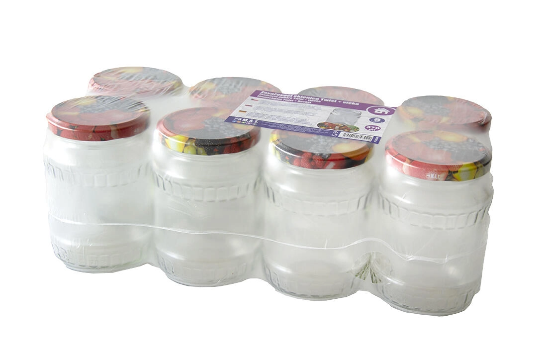 Praktičen komplet kozarcev za vlaganje s prostornino 370 ml z zapiranjem tipa TWIST 66 in sadnim dekorjem. Idealen za domače konzerviranje manjših porcij džemov, omak ali zelenjave. Komplet vsebuje 8 kosov kozarcev in pokrovčke s sadnim motivom za varno in zanesljivo vlaganje.