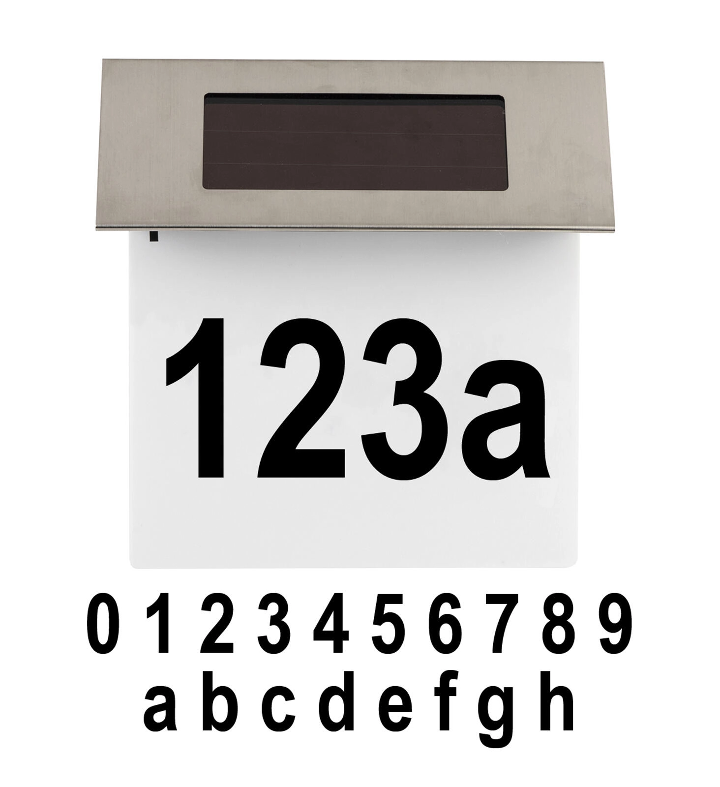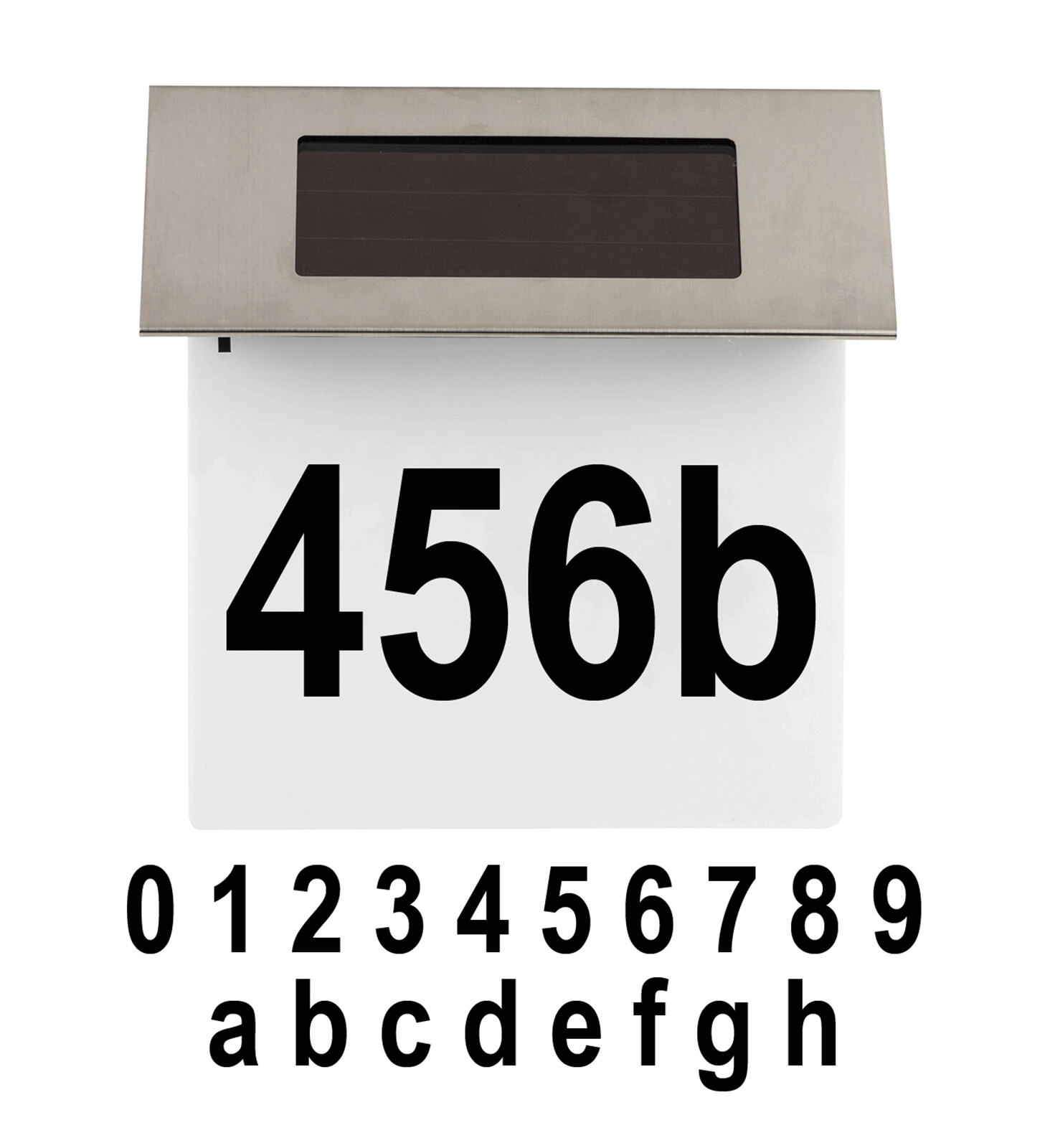 Osvetljena bela ploščica in kontrastne nalepke zagotavljajo odlično berljivost vaše hišne številke po temi.