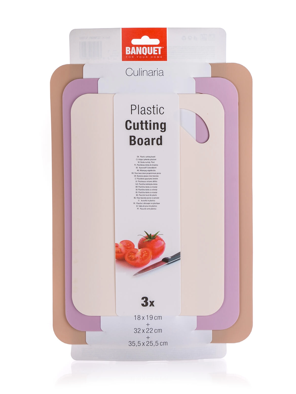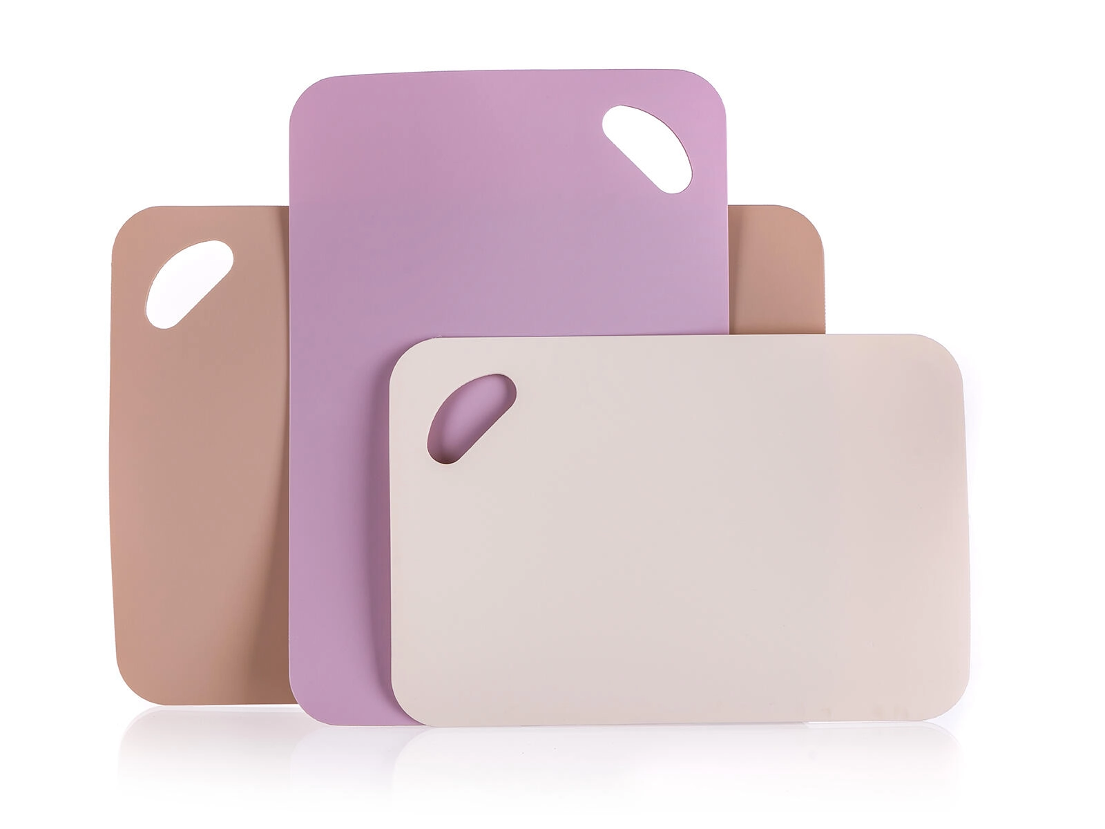 Praktičen set treh desk za rezanje za vsakodnevno kuhanje. Različne velikosti in nedrseča površina zagotavljajo varno rezanje, odporna plastika se zlahka čisti, odprtine za obešanje pa olajšajo shranjevanje. Eleganten barvni miks bež, rjave in vijolične dopolni vašo kuhinjo.
