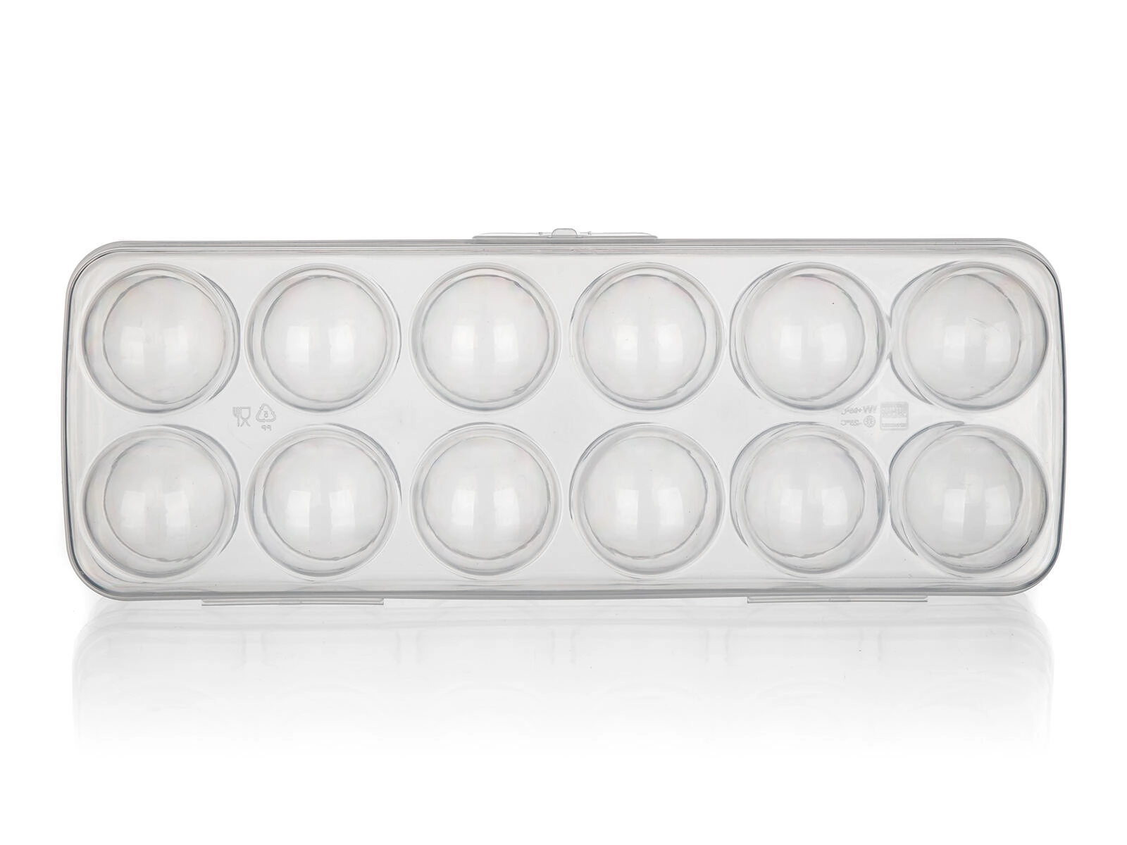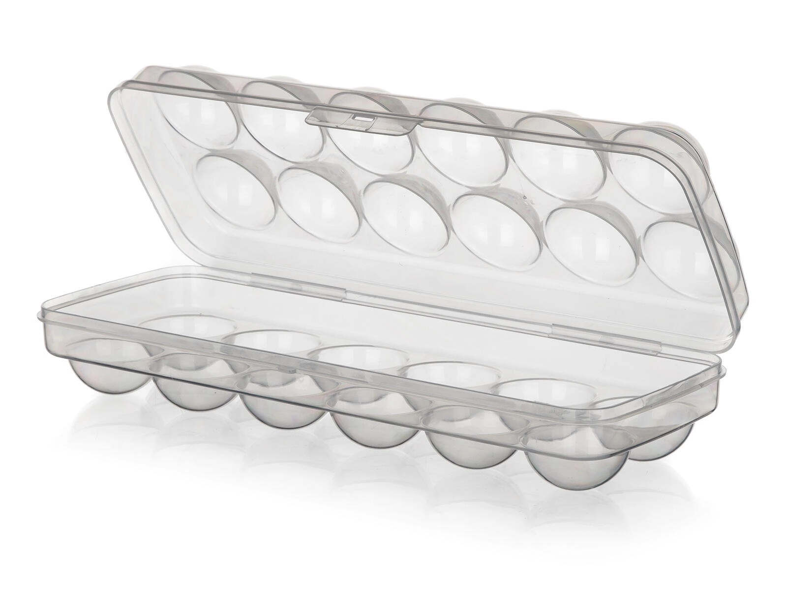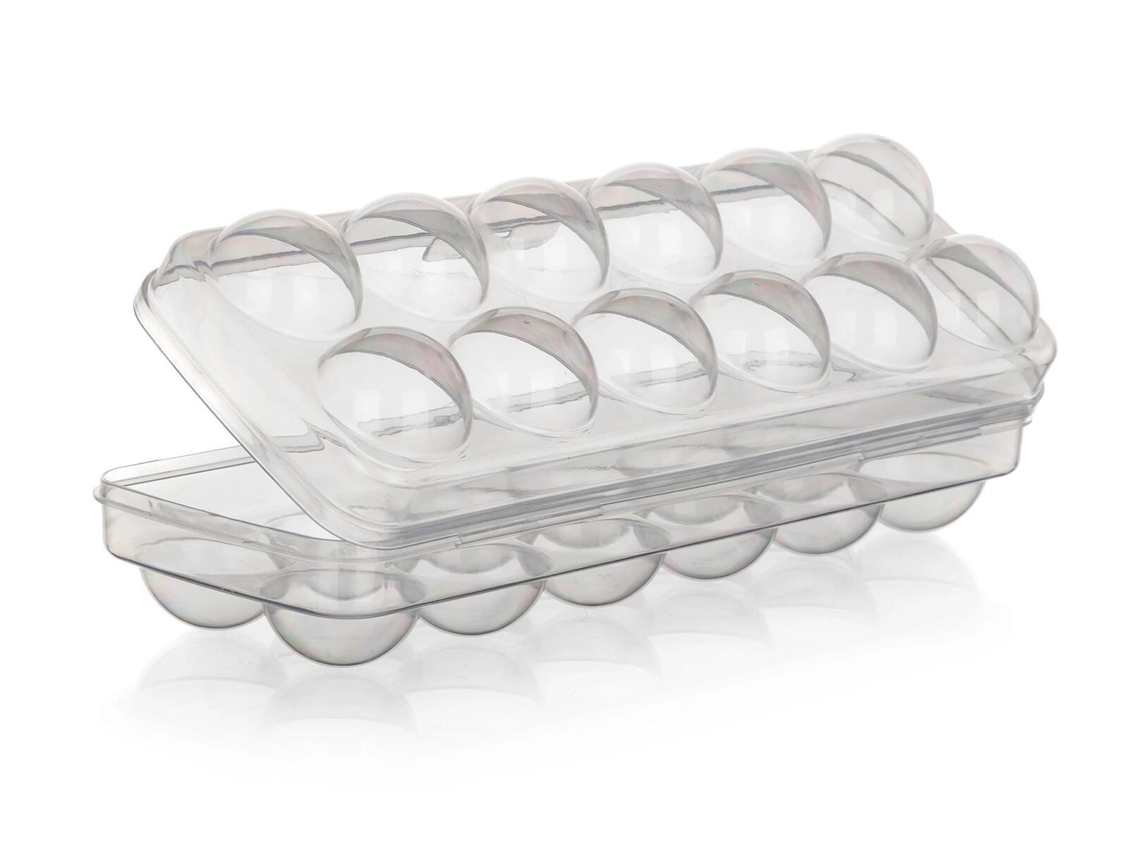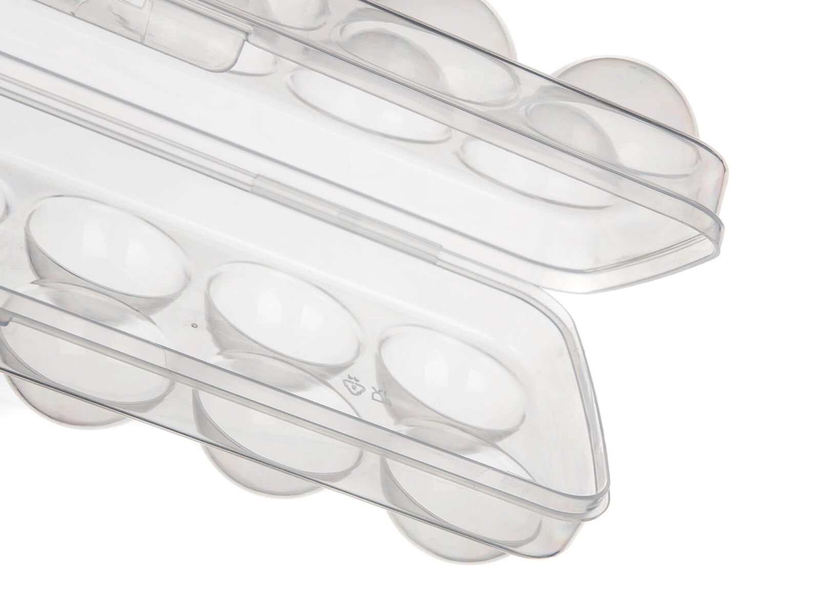 Ergonomsko oblikovane vdolbine preprečujejo kotaljenje in pokanje jajc. Nizek profil in raven pokrov omogočata preprosto zlaganje v hladilniku in v vratnih policah, zato prihranita prostor in zagotavljata red.