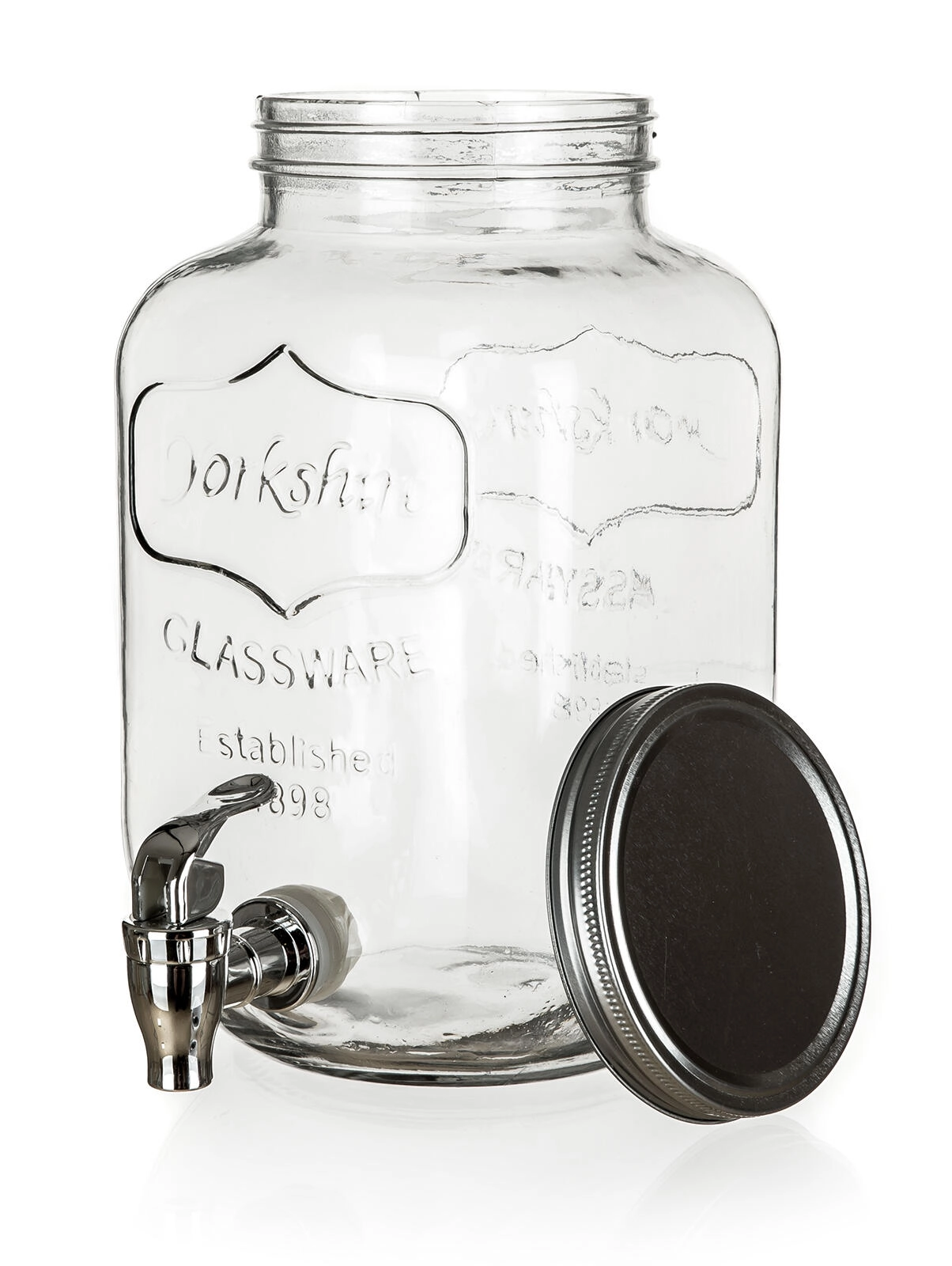 Čvrsto steklo zagotavlja stabilnost in pregled nad vsebino, kovinski pokrov pa ščiti pijače pred nečistočami.