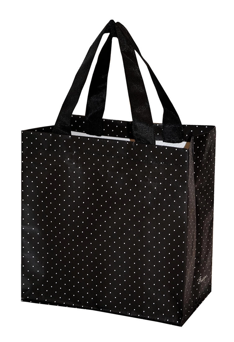 Ta modna torba v črno‑belem, pikčastem dizajnu je idealna za vsakodnevne nakupe in hitre opravke. Zahvaljujoč čvrstemu materialu iz tkanega laminiranega polipropilena prenese nosilnost do 10 kg, obenem pa ohranja nizko težo in dolgo življenjsko dobo. Kompaktne mere 27 × 27 × 15 cm in prostornina 10 l zagotavljajo, da jo zlahka pospravite v omarico, avto ali torbico.