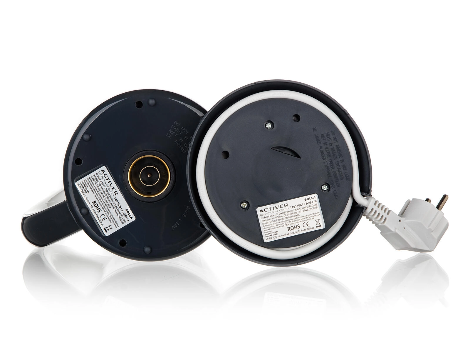 Vrtljiva osnova s sredinskim priključkom omogoča udobno postavitev grelnika iz kateregakoli kota. Za varnost skrbijo zaščita pred pregrevanjem in samodejni izklop po doseženem vretju, dopolnjena z ročnim stikalom ter svetlobno signalizacijo delovanja.