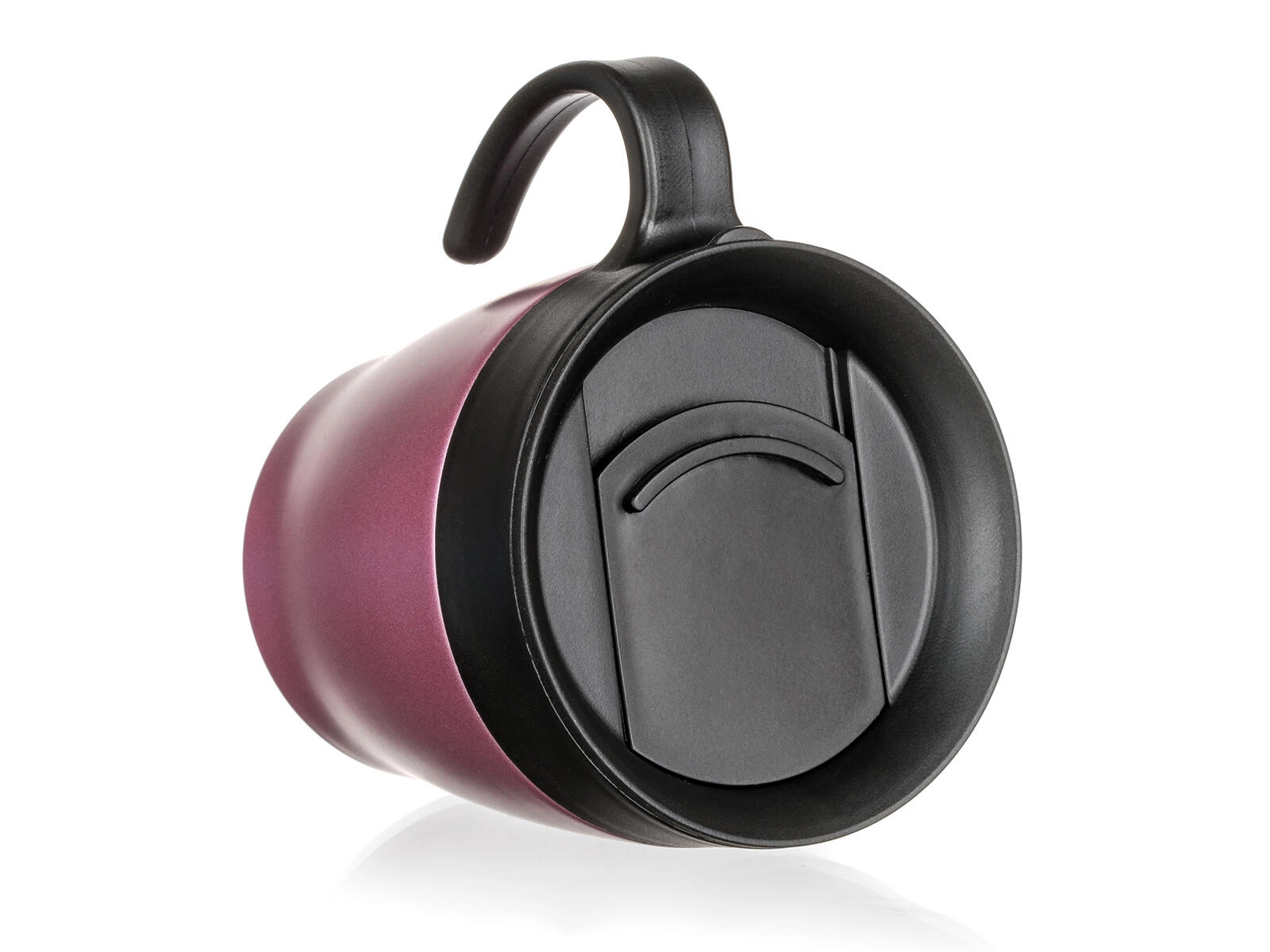 Praktičen pokrov z drsnim pitnim odprtkom zmanjšuje tveganje razlitja med hojo ali vožnjo. Za večjo varnost lonček hranite v pokončnem položaju.