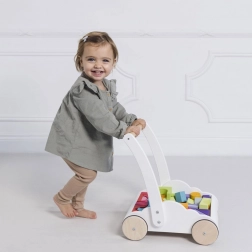 Popolna igrača za malčke, ki se učijo hoditi. Ta edinstven voziček otrokom pomaga pri telesnem in duševnem razvoju zahvaljujoč stabilni in varni zasnovi.