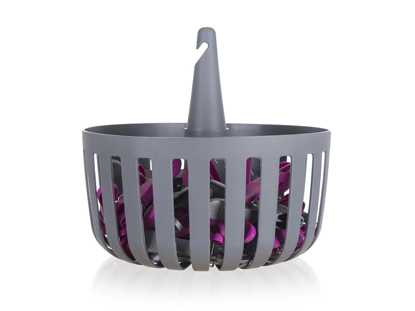 Praktičen set za vsakodnevno sušenje perila: viseča košara s kljukico in 30 vzdržljivimi plastičnimi ščipalkami v mešanici barv vijolična in antracitna. Košaro lahko obesite neposredno na vrv, zato imate ščipalke vedno pri roki in je sušenje hitrejše ter udobnejše.
