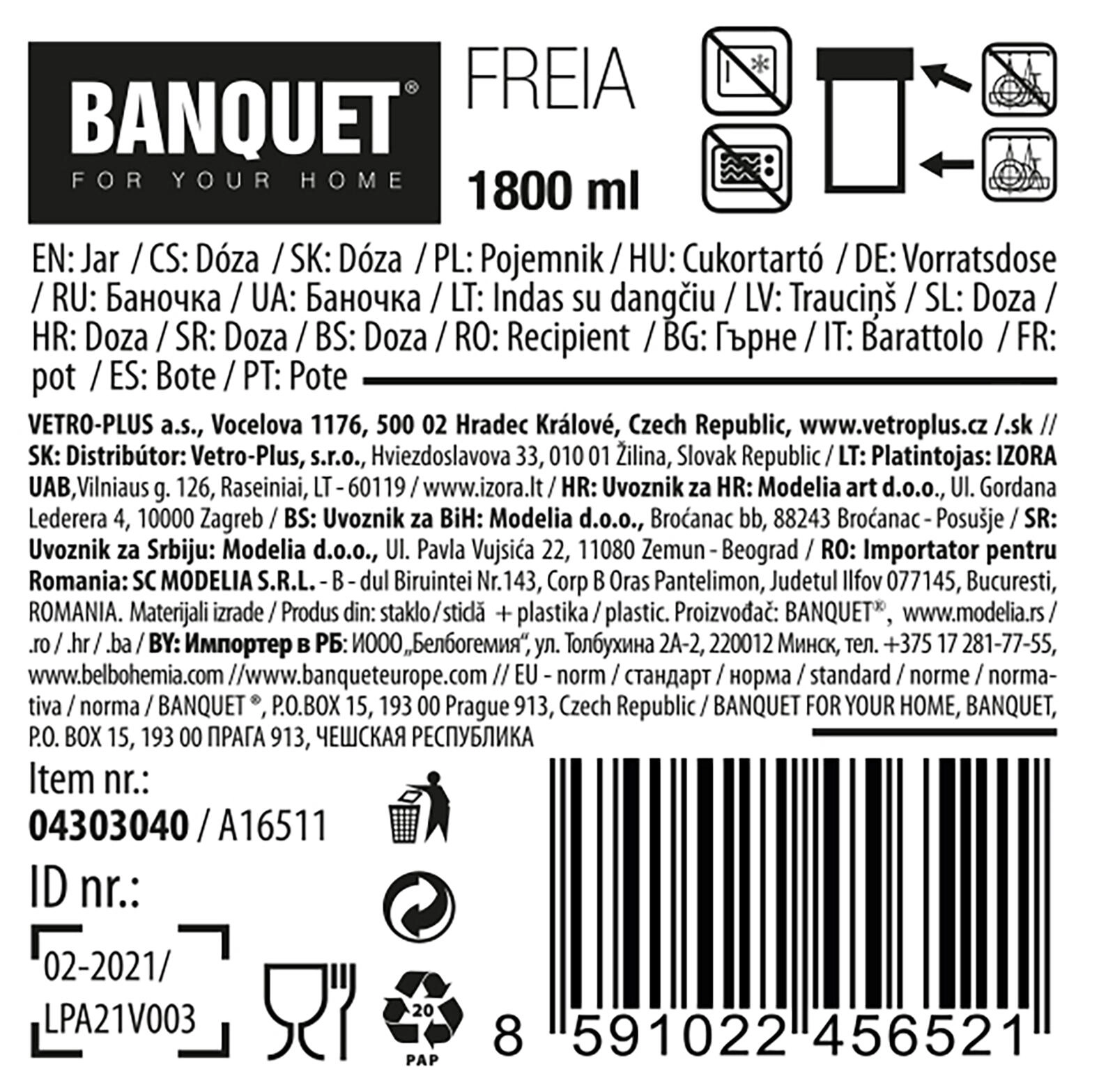 Praktična steklena doza FREIA s prostornino 1,8 l in elegantnim pokrovom iz nerjavečega jekla je idealna za shranjevanje živil. Zahvaljujoč prosojnemu steklu imate vsebino vedno na očeh, pokrov pa pomaga ohranjati svežino, okus in aromo shranjenih sestavin.