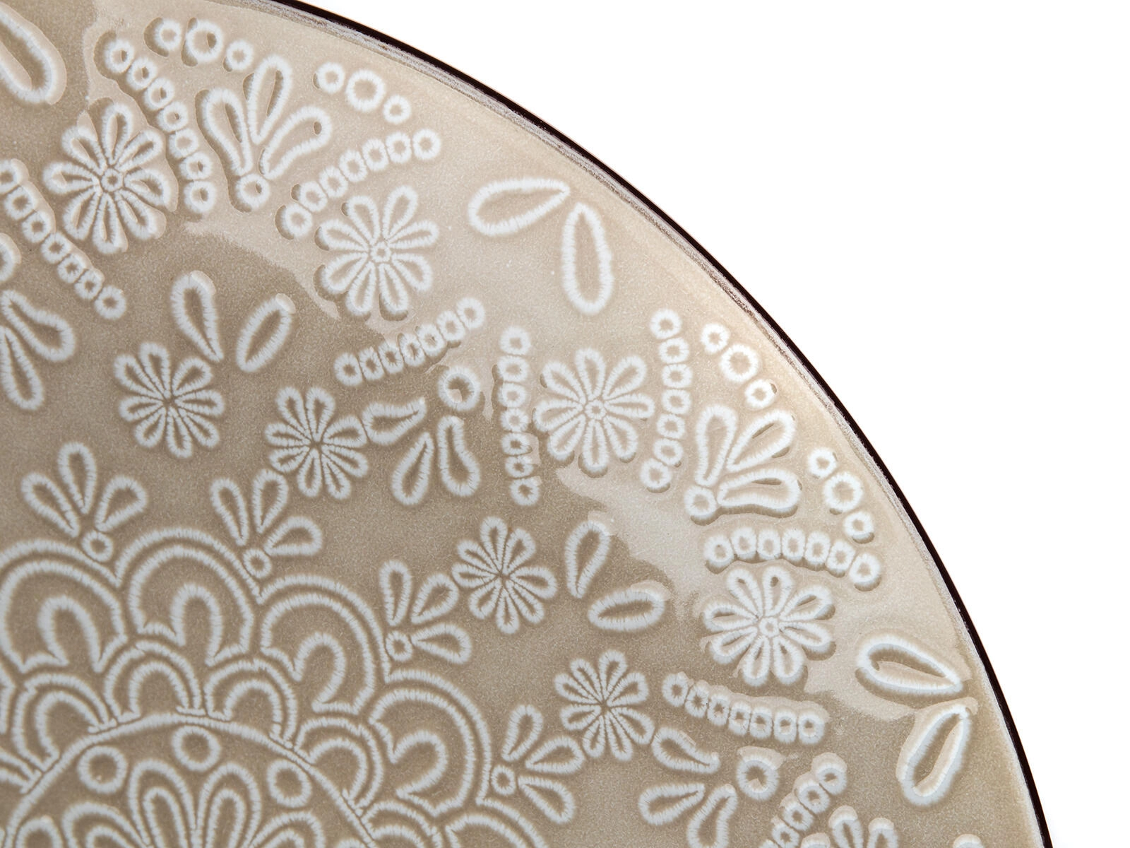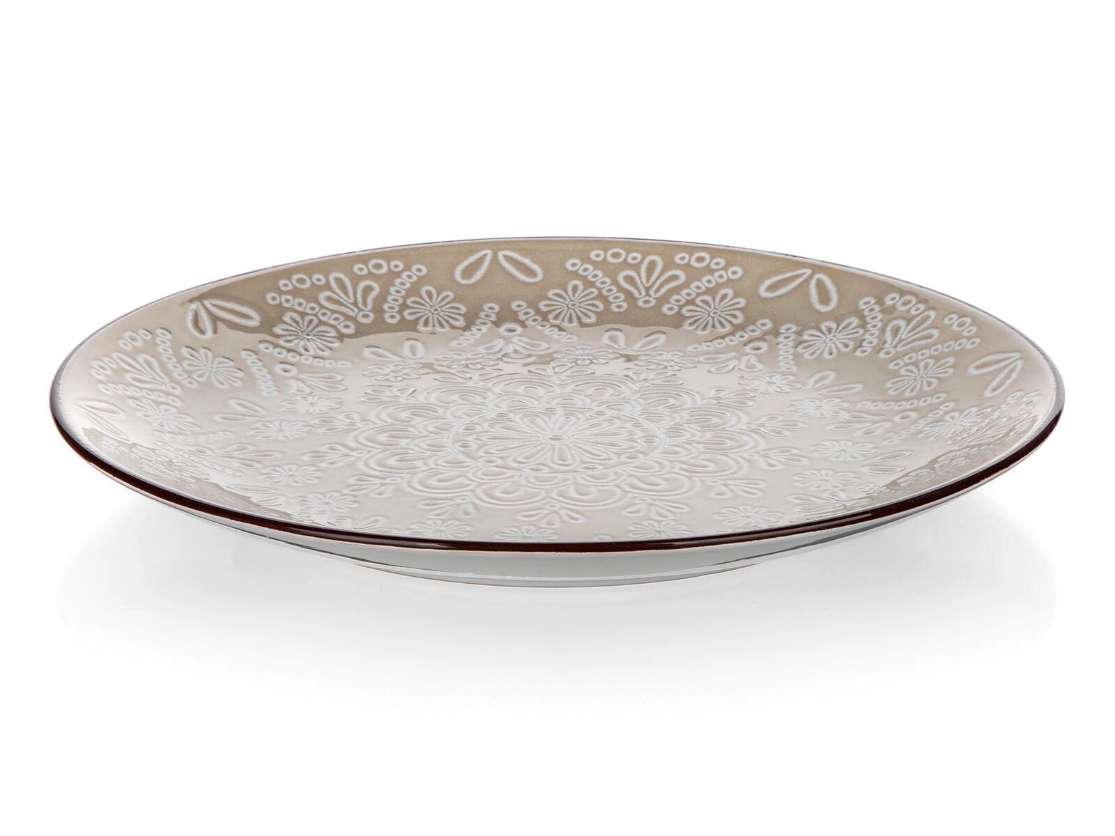 Reliefni čipkasti motiv s temnejšim robom krožniku daje edinstven značaj in vsako postrežbo spremeni v estetski užitek.