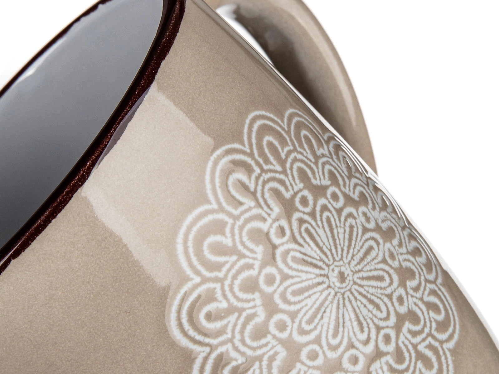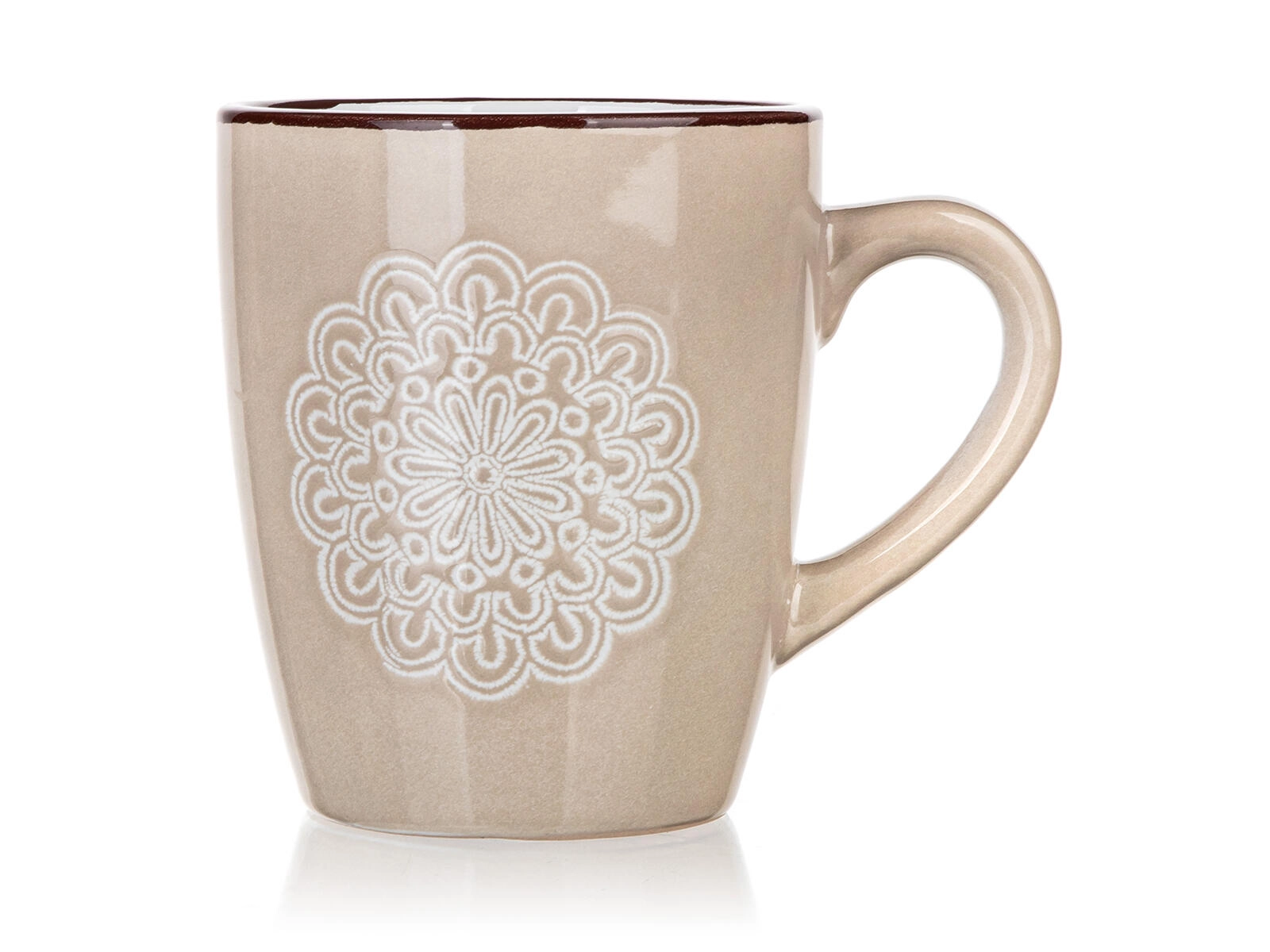 Odkrijte skodelico, ki združuje diskreten dizajn z vsakodnevno praktičnostjo. Krem odtenek in reliefni čipkasti (mandala) vzorec vašemu pogrinjku dodata nežno eleganco, medtem ko je prostornina 400 ml idealna za kapučino, čaj in zeliščne napitke.