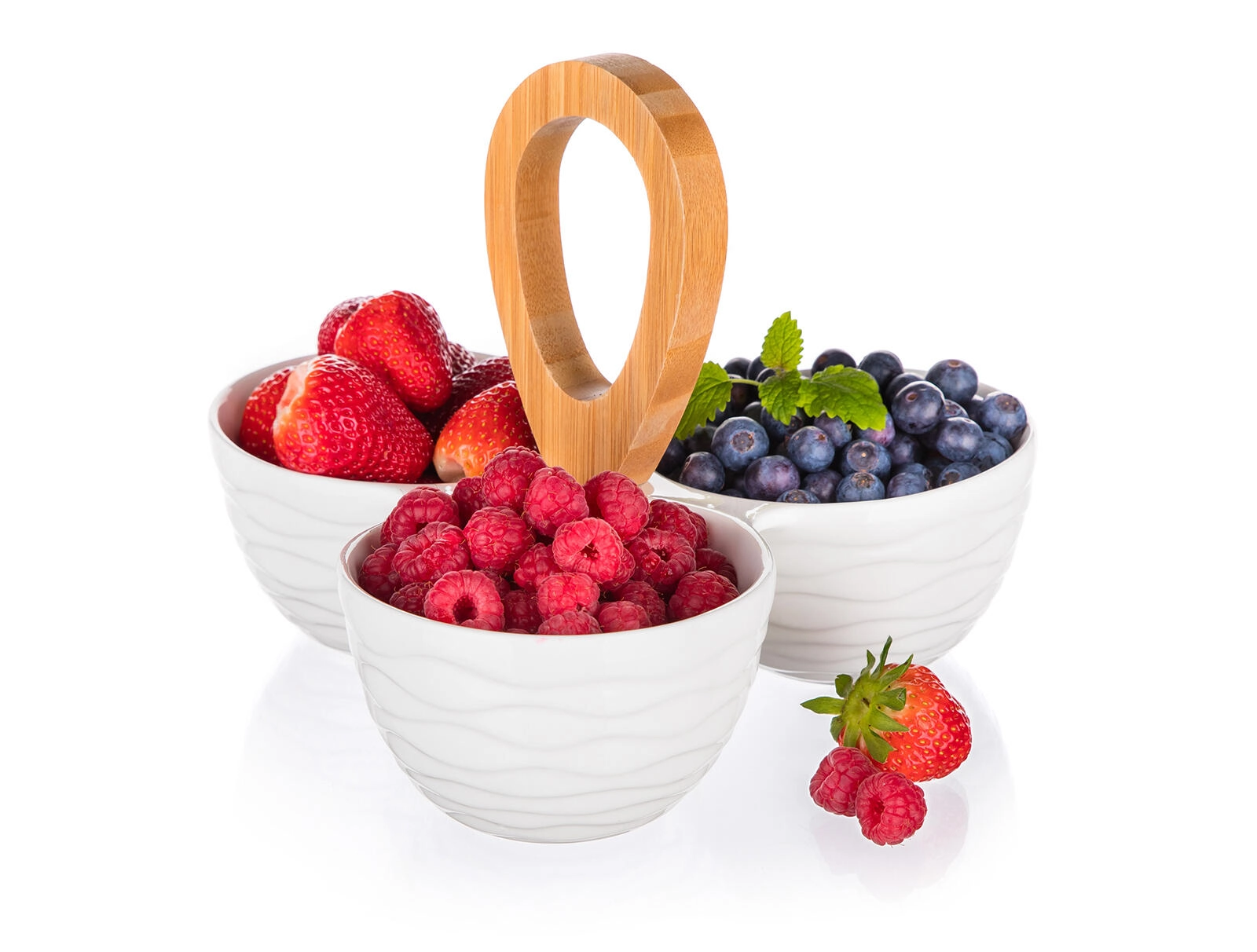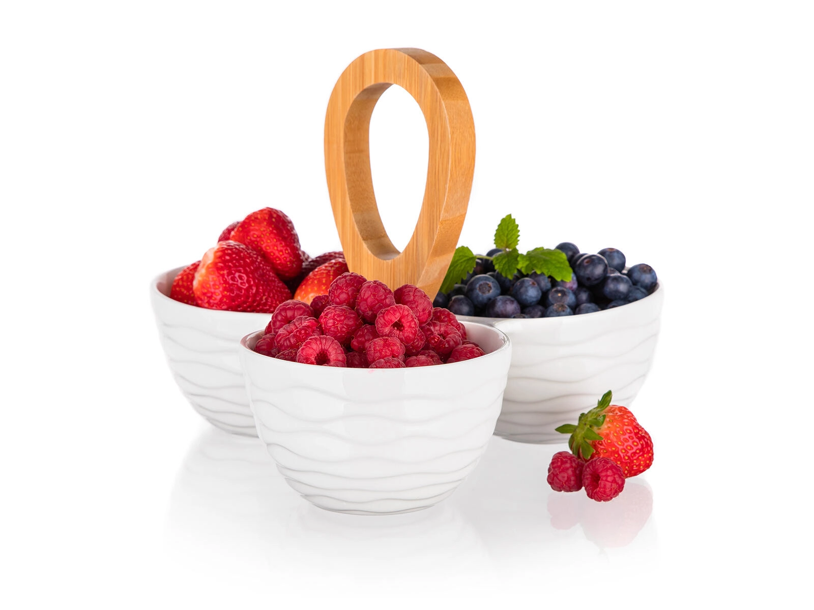 Odkrijte praktično in stilsko rešitev za vsakodnevno obedovanje in praznične pogostitve. Tri bele porcelanaste sklede z nežnim valovitim reliefom so razporejene okoli čvrstega bambusnega ročaja, ki olajša prenašanje in strežbo za mizo. Komplet je odlična izbira za oreščke, olive, suho sadje, omake ali drobne sladkarije.