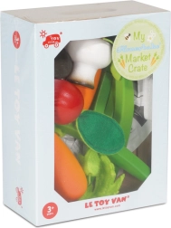 V kompletu je 9 podrobno izdelanih kosov zelenjave ter leseni zabojček z logotipom blagovne znamke. Igrača je del nagrajene kolekcije Honeybake, ki razvija kognitivne veščine, socialno interakcijo in jezikovni razvoj z imitativno igro.