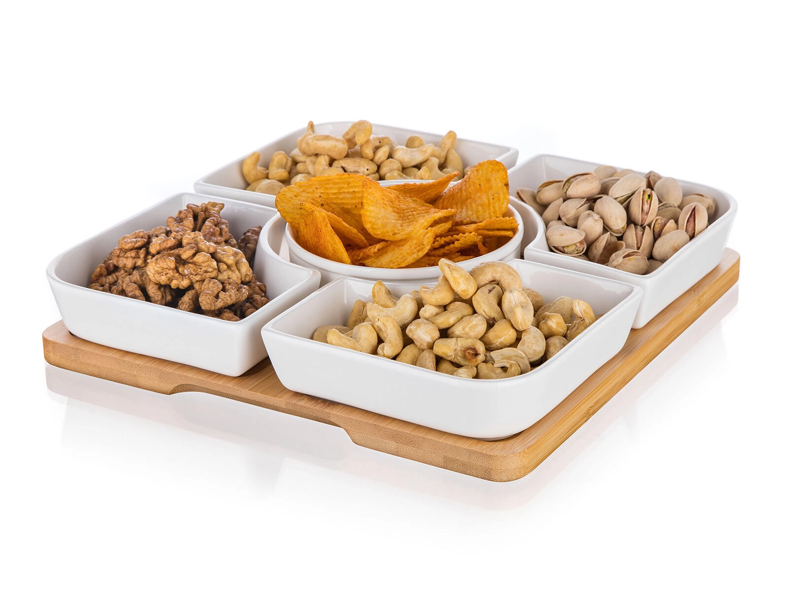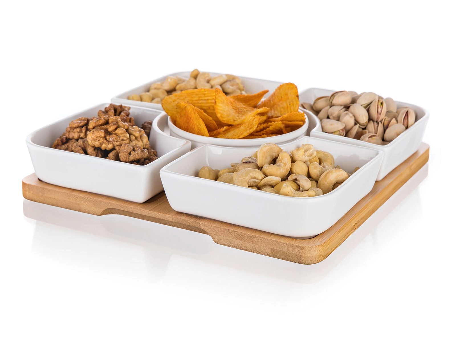 Eleganten servirni komplet BRILLANTE združuje kakovosten porcelan in naravni bambus za slogovno postrežbo prigrizkov. Šestdelni set s petimi skledicami in pladnjem dimenzij 24,5 × 24,5 × 4,5 cm je popoln za oreščke, olive, suho sadje ali pomake in dipe. Enostaven je za prenašanje, vzdrževanje in omogoča pregledno, organizirano serviranje za vsako priložnost.