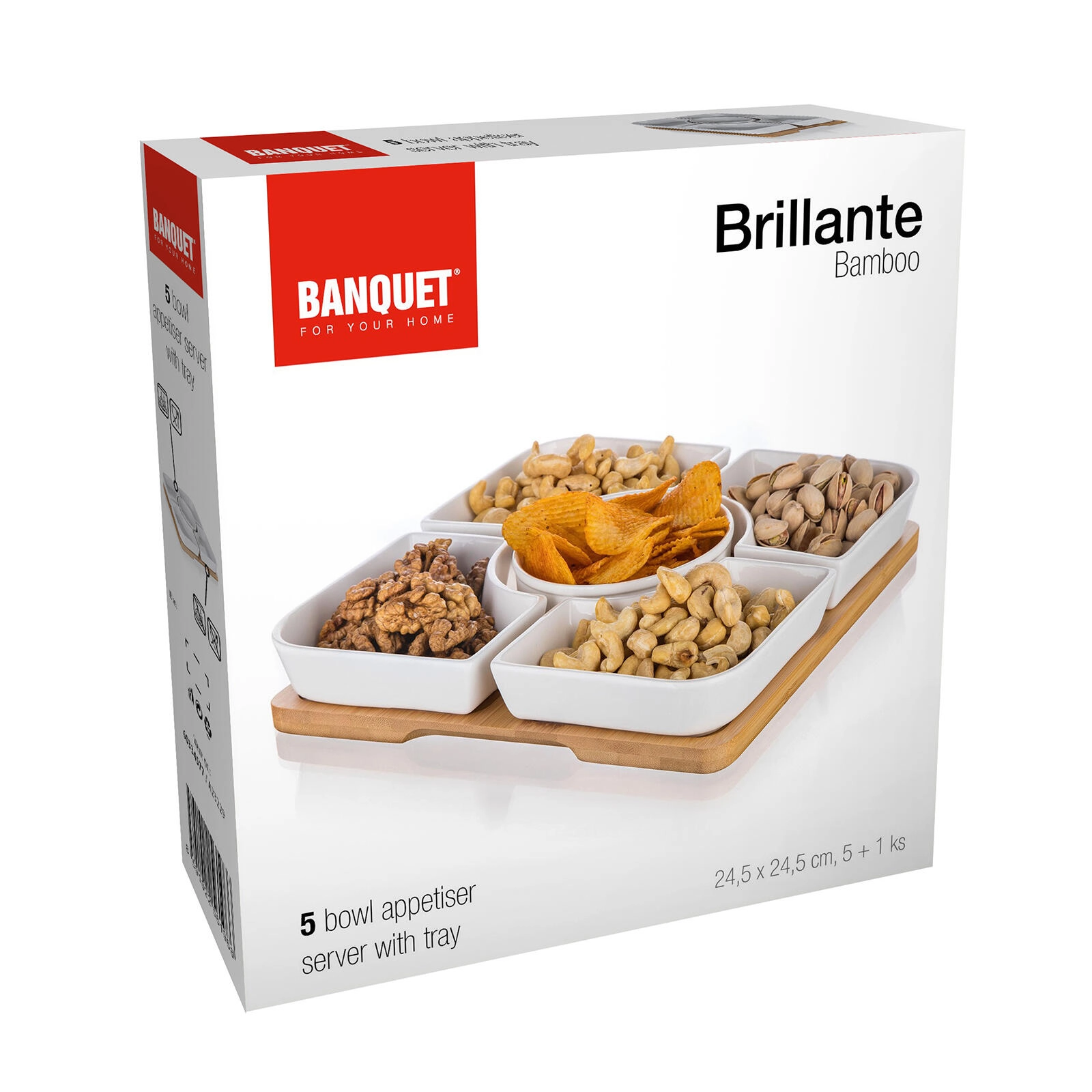 Izboljšajte svojo pogostitev s praktičnim in dovršenim servirnim kompletom BRILLANTE. Pet belih porcelanastih skledic (štiri oglata in ena okrogla na sredini) je nameščenih na trdnem bambusovem pladnju. Set omogoča pregledno razporeditev dobrot in je odličen za družinska praznovanja, večere s prijatelji ter vsakodnevno postrežbo.