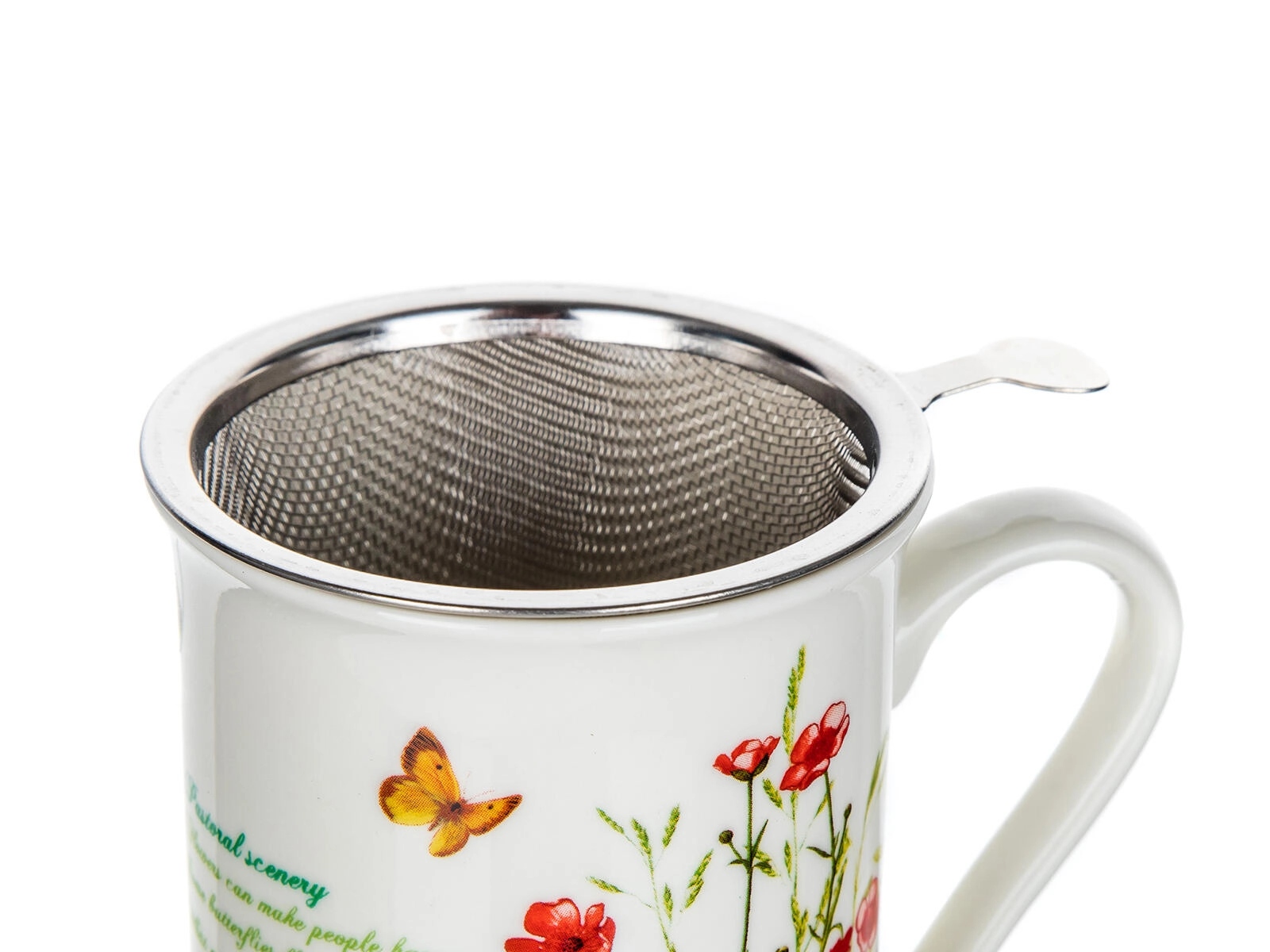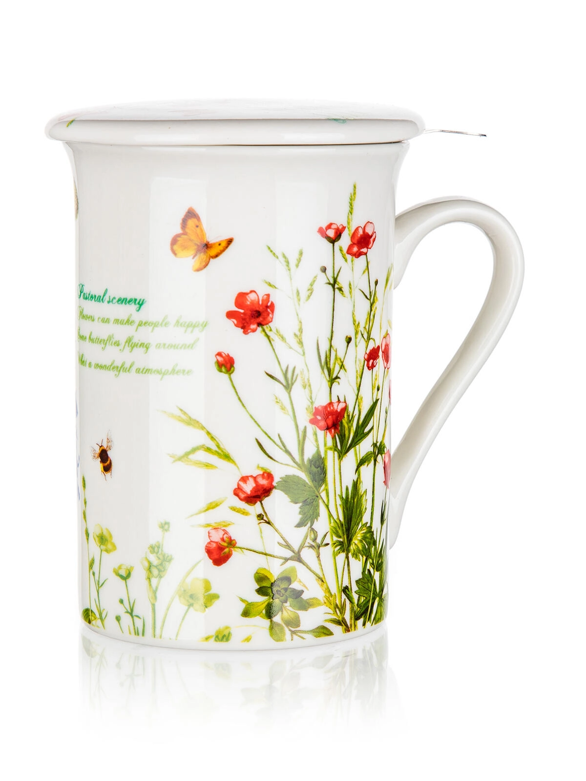 Diskreten motiv travniških cvetlic skodelico spremeni v eleganten dodatek za dom in pisarno – odlična ideja za darilo za ljubitelje čaja.