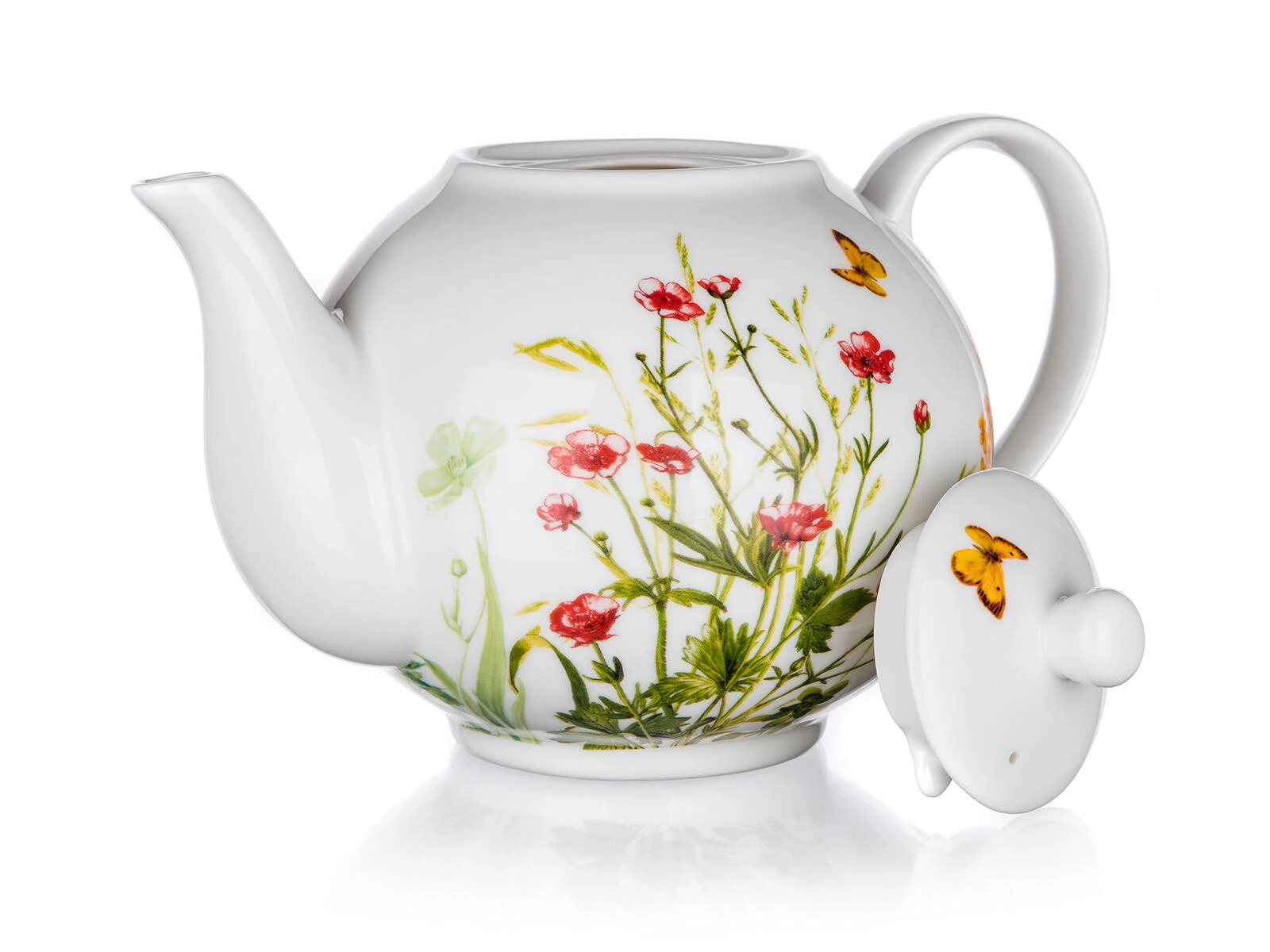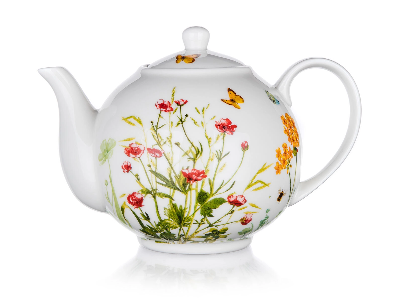 Odkrijte čar postrežbe s čajnikom Meadow, ki združuje brezčasni dizajn in praktičnost. Bela glazura z dekorativnimi cvetovi in metulji deluje nežno in elegantno, zato je čajnik primeren tako za jutranjo kavo kot popoldanski čaj s prijatelji.