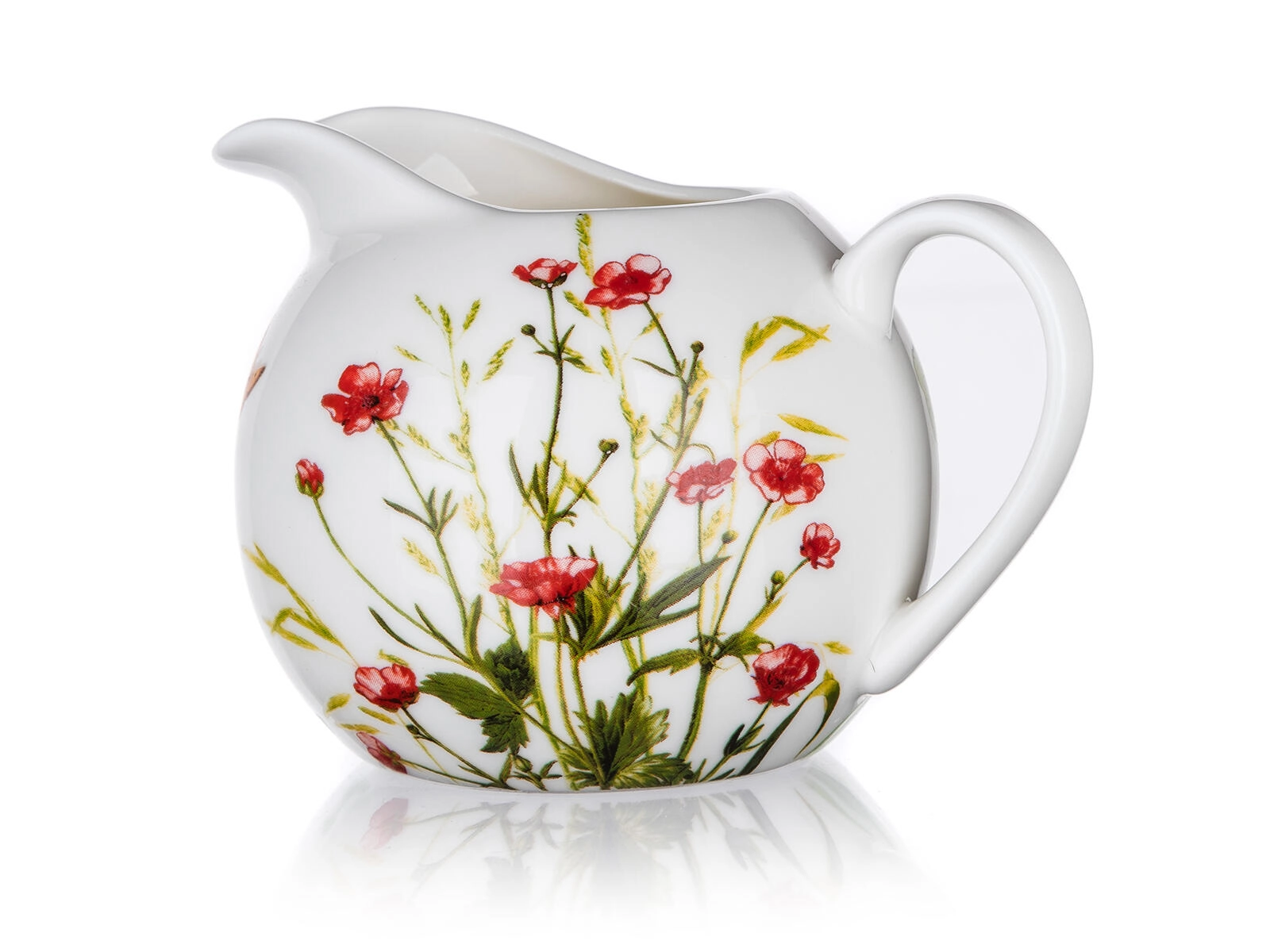 Vnesite na svojo mizo nežen pridih narave. Keramični vrček za mleko Meadow s kapaciteto 250 ml navduši z sijočim belim glazurom in podrobnim cvetličnim vzorcem z metulji. Ergonomski ročaj in oblikovano izlivalno ustje omogočata udobno in natančno prelivanje mleka ali smetane.