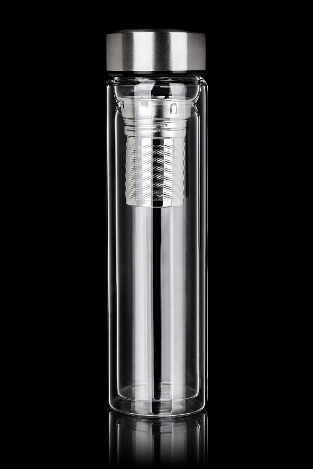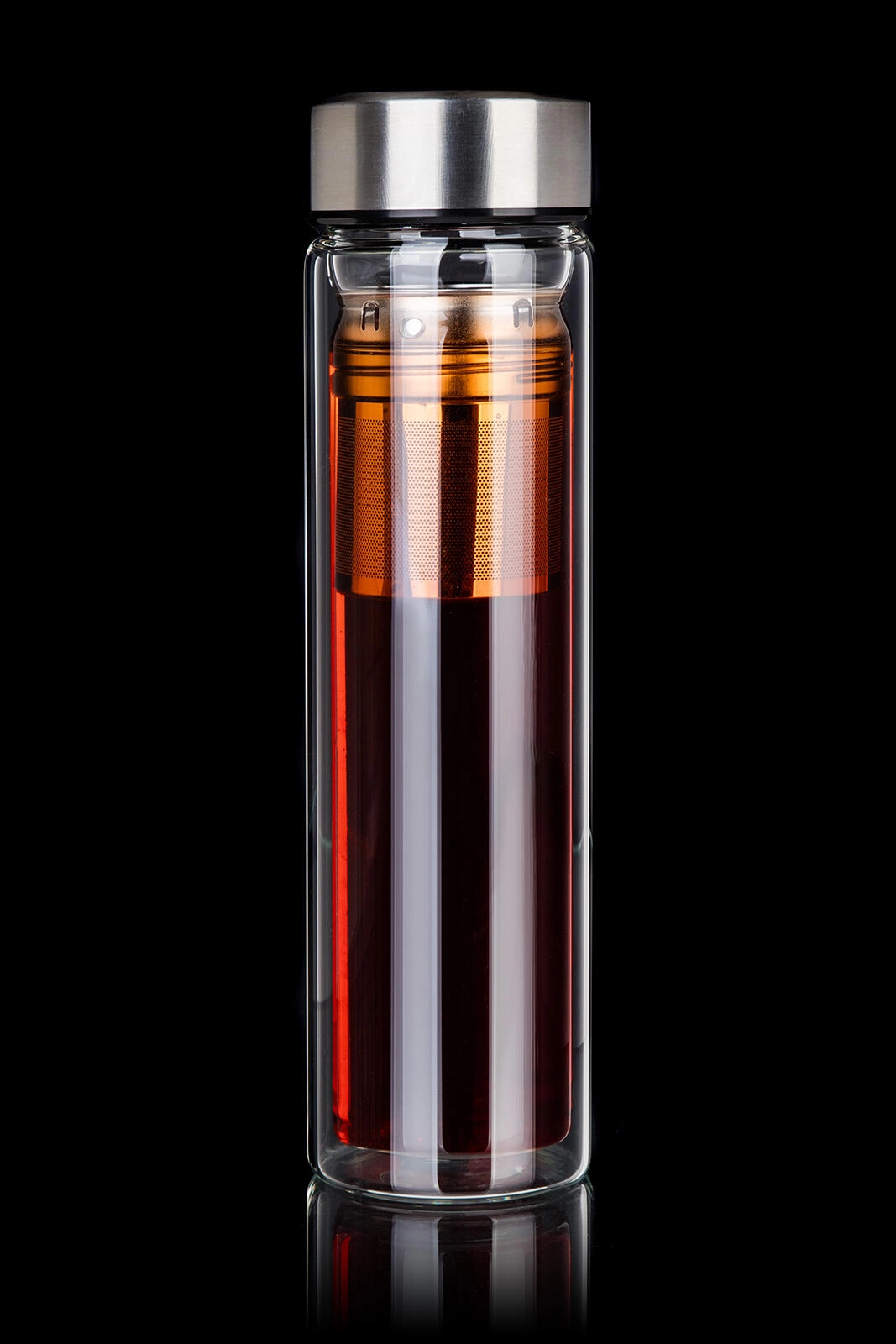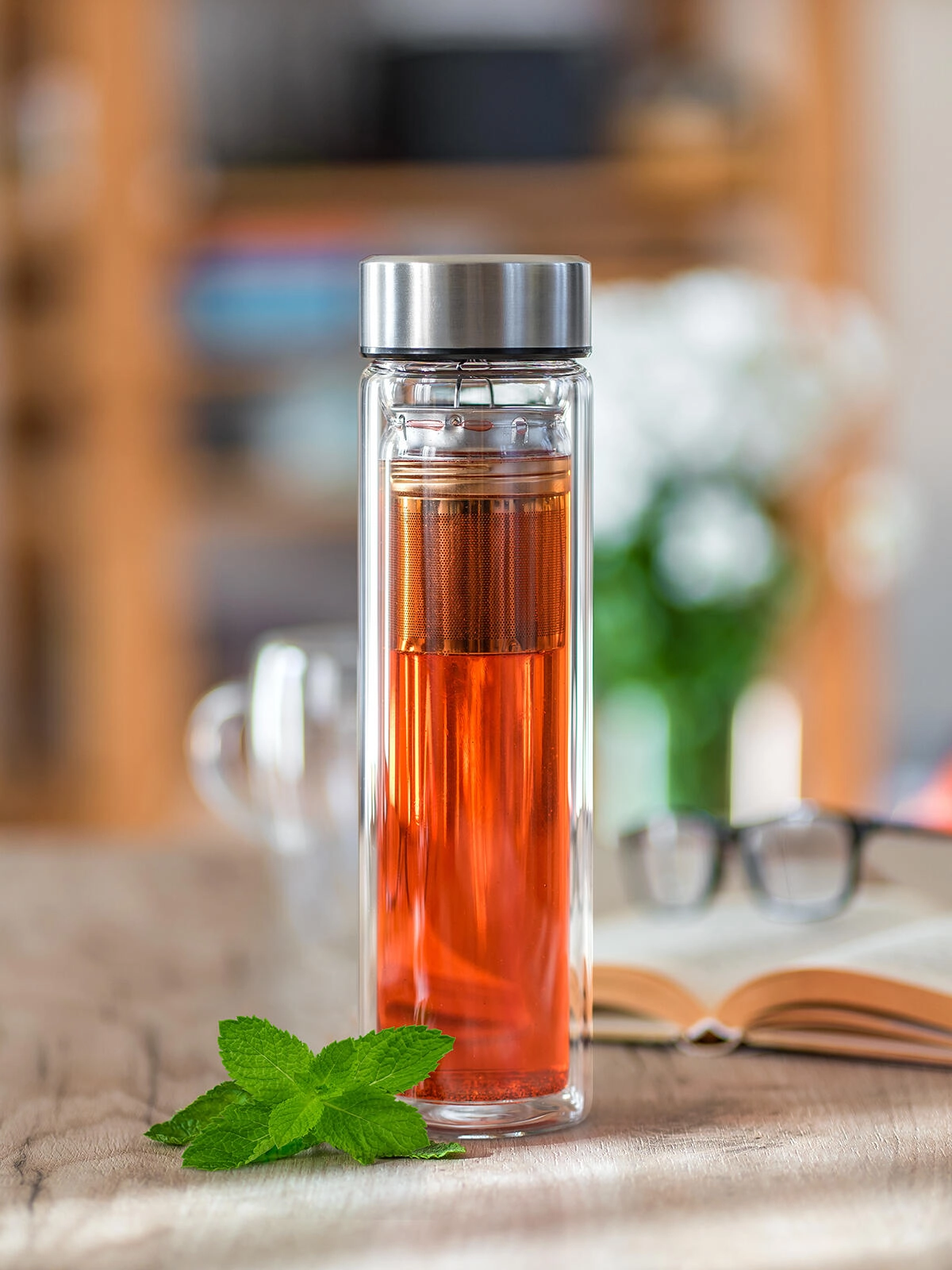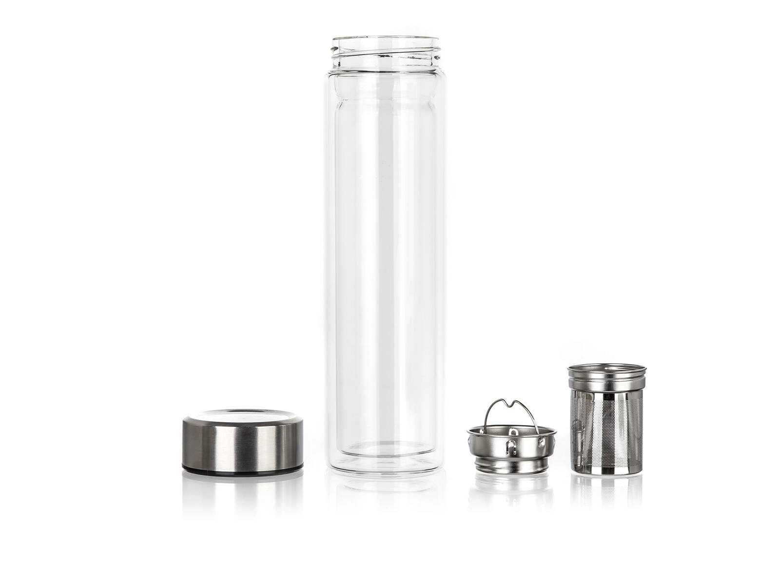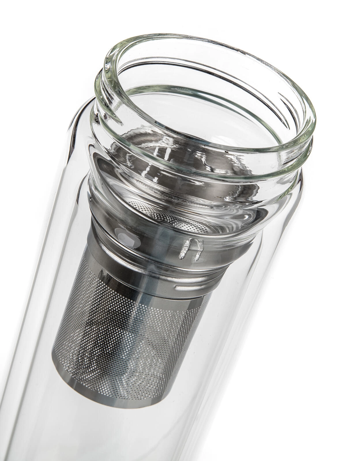 Del kompleta je odstranljivo fino cedilo iz nerjavnega jekla, ki omogoča udobno namakanje sipanega čaja ali pripravo infuzij z zelišči in sadjem neposredno v steklenici. Pokrov iz nerjavnega jekla 18/8 zagotavlja higieno, trpežnost in varno zapiranje. Čista, moderna zasnova iz prozornega stekla dodatno poudari barvo pijače.