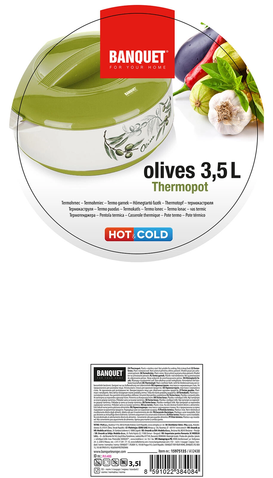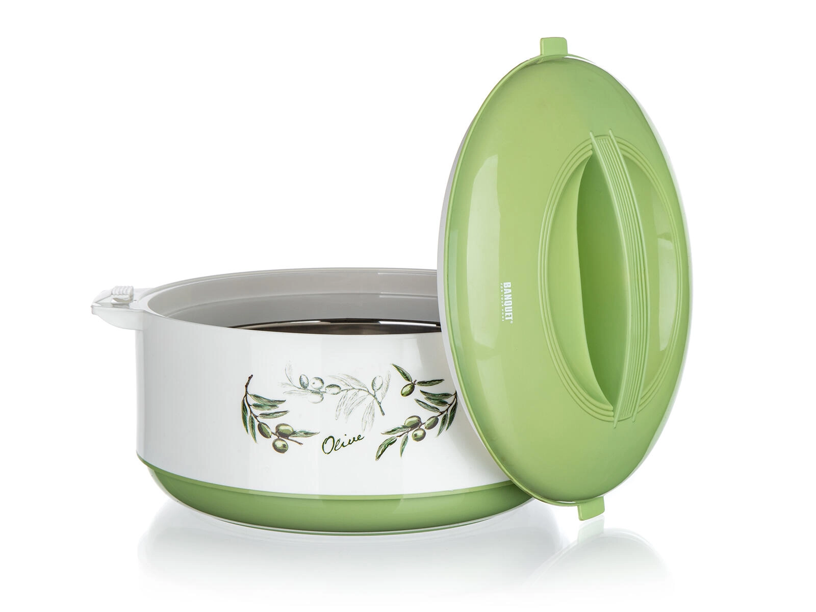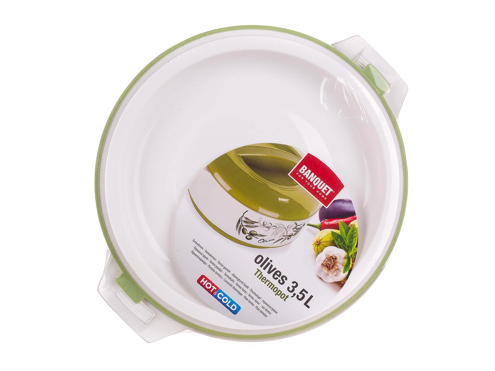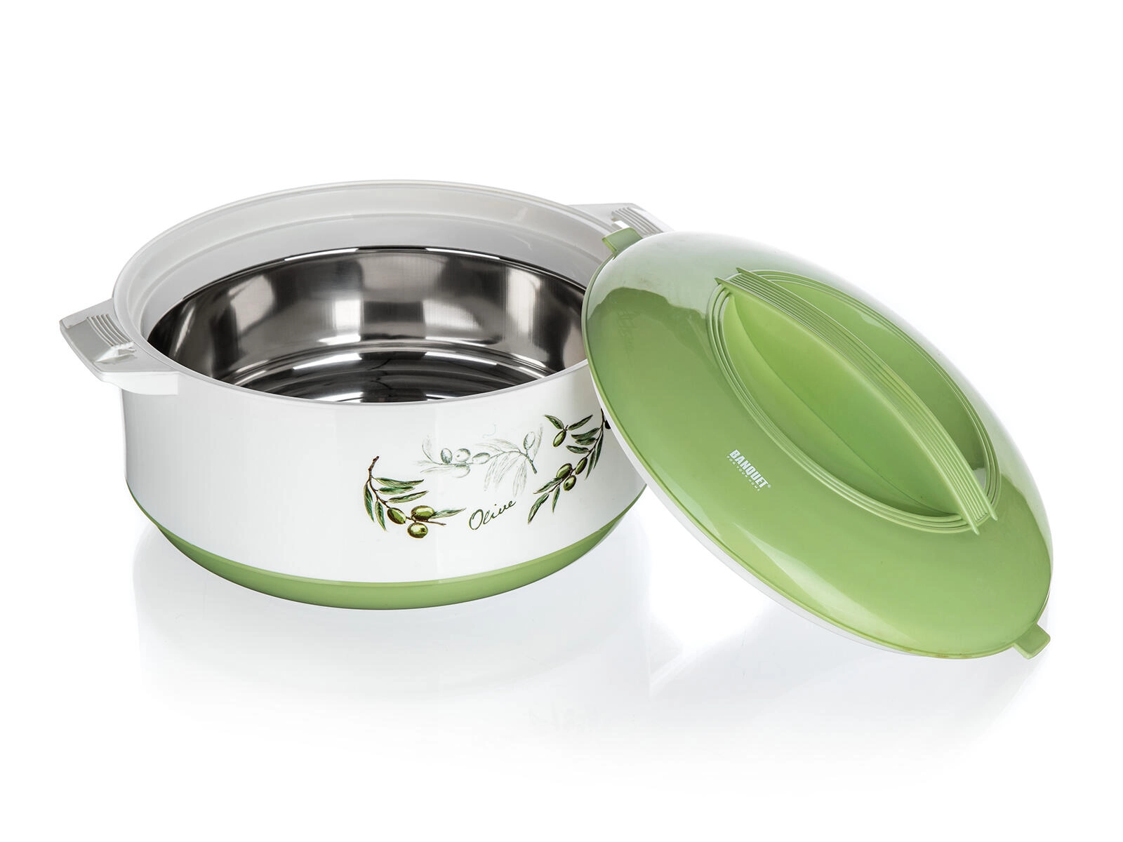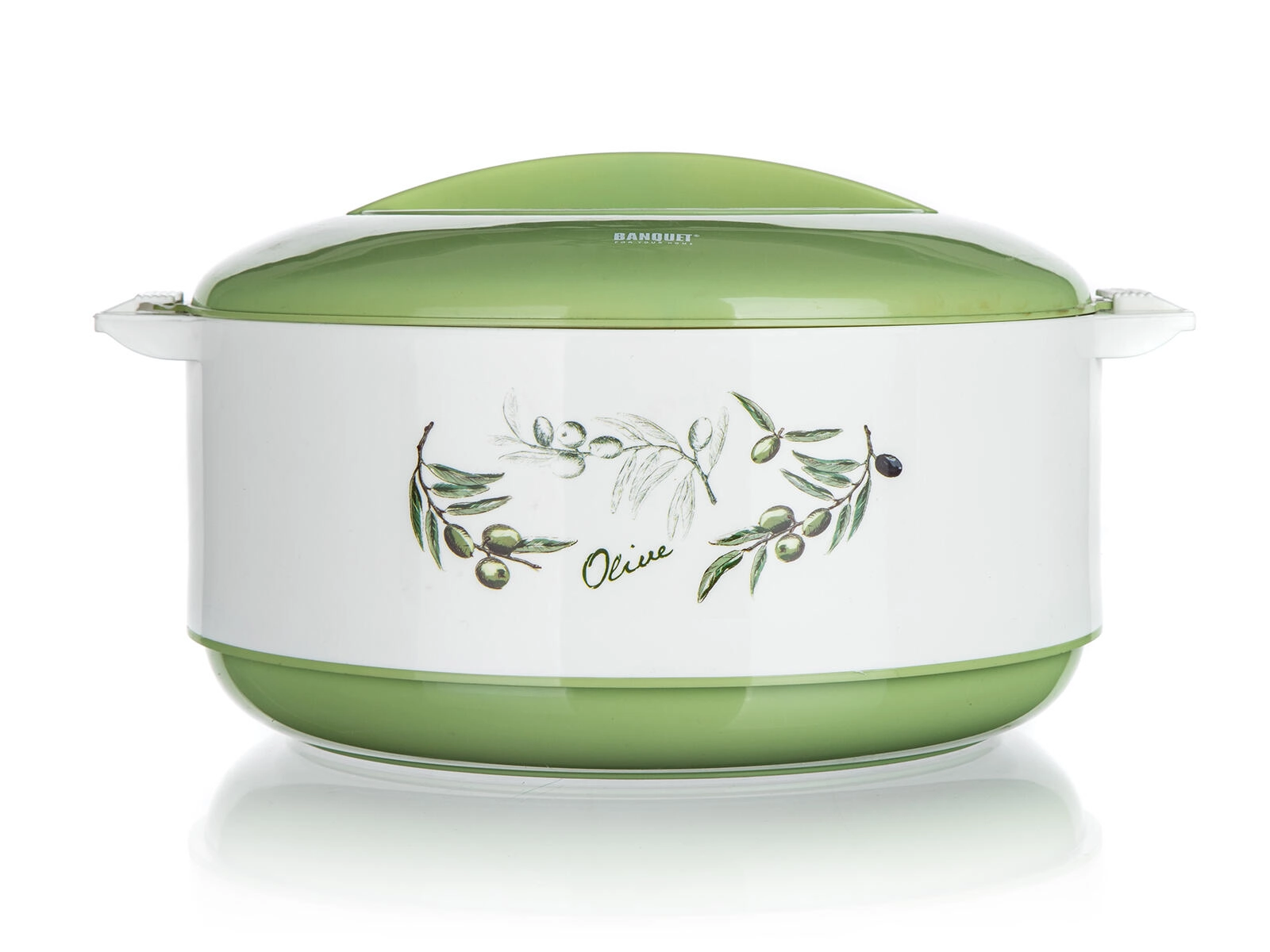 Slogovita termoposoda OLIVES s prostornino 3,5 l je nepogrešljiv pomočnik za vsakdanje in praznično pogrinjanje. Dvojna konstrukcija z notranjo nerjavečo posodo in PUR izolacijo ohrani jedi dlje na želeni temperaturi brez izgube okusa in sočnosti. Eleganten oljčni dekor se prilega vsaki kuhinji in mizi.