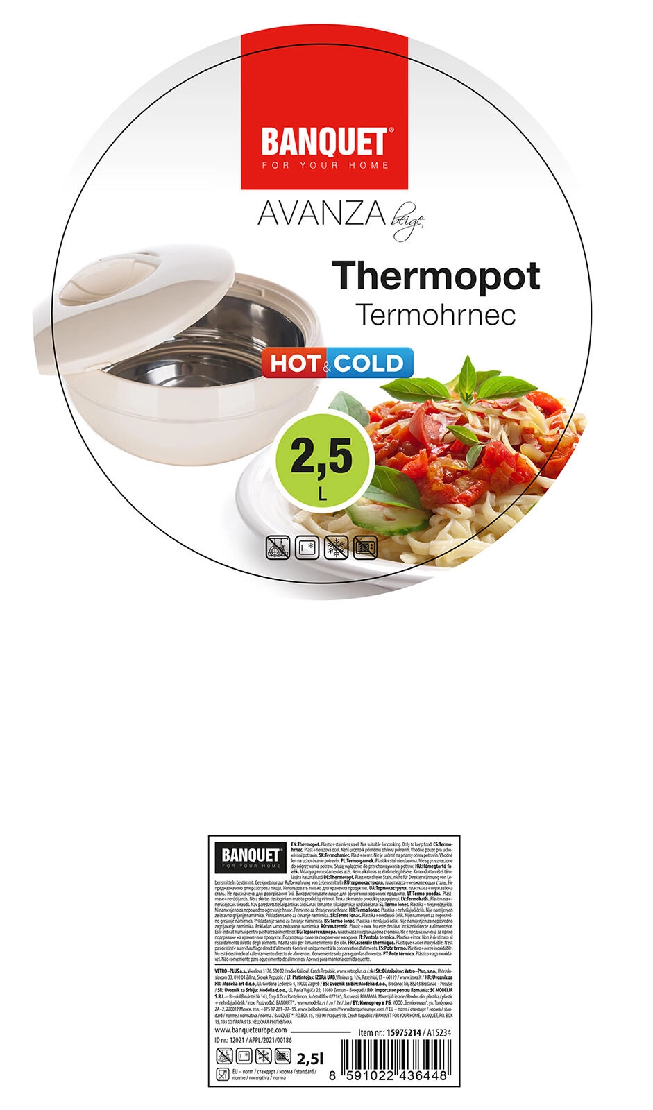 Termoposoda AVANZA s prostornino 2,5 l je odličen pomočnik za vsako kuhinjo. Notranja nerjavna jeklena posoda in polnilo iz PUR pene zagotavljata zanesljivo toplotno izolacijo, zato bodo vaše juhe, omake ali priloge ohranile pravo temperaturo vse do serviranja. Elegantna bež izvedba se lepo poda vsaki mizi.