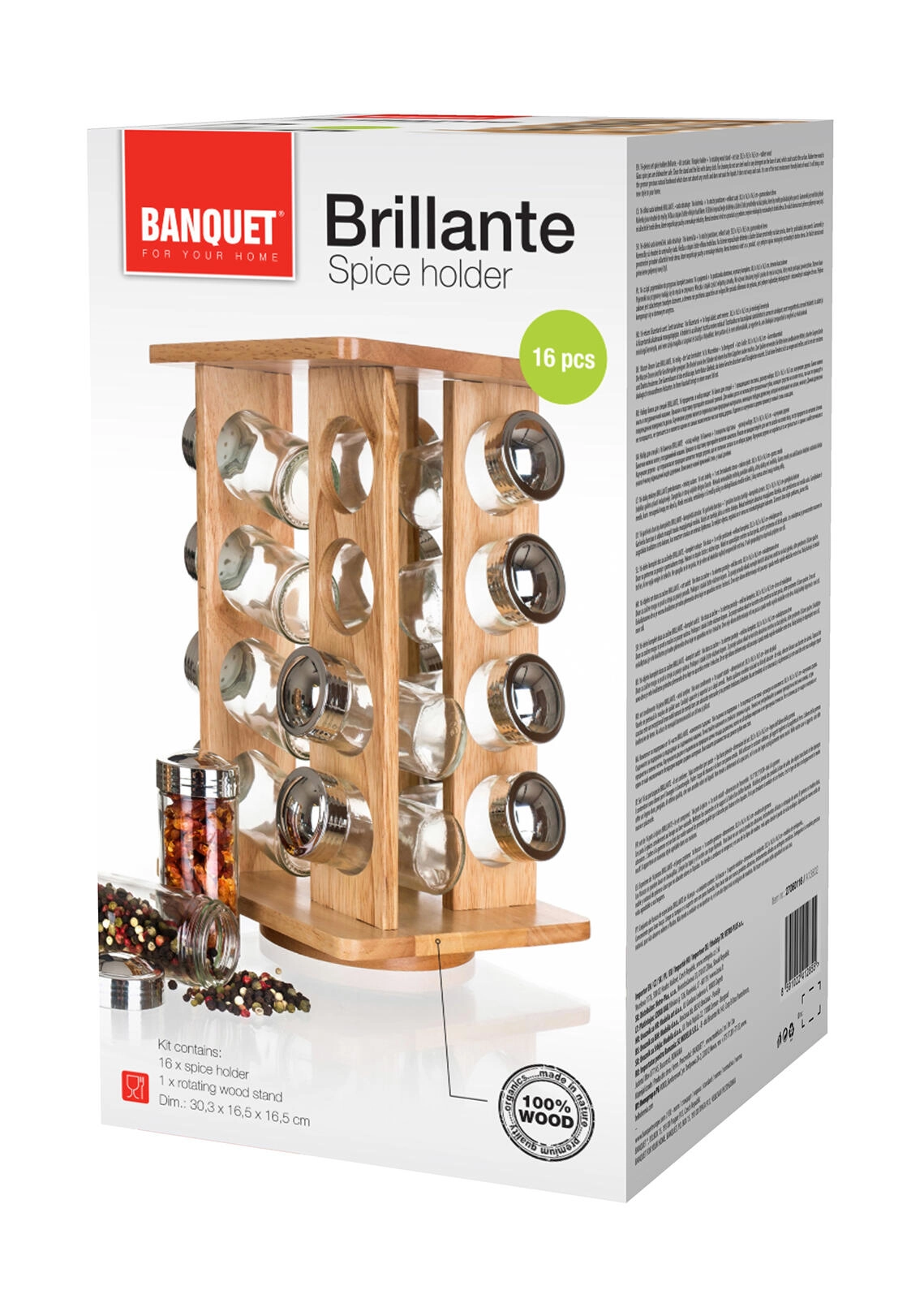 Odkrijte praktično in stilsko rešitev za organizacijo začimb. Vrtljivo stojalo iz kakovostnega lesa kavčukovca je stabilno, odporno in ne vpija vonjav ali tekočin. Šestnajst prozornih steklenih kozarčkov s kromiranimi pokrovčki poudarja moderen videz in omogoča preprost nadzor nad zalogo začimb.