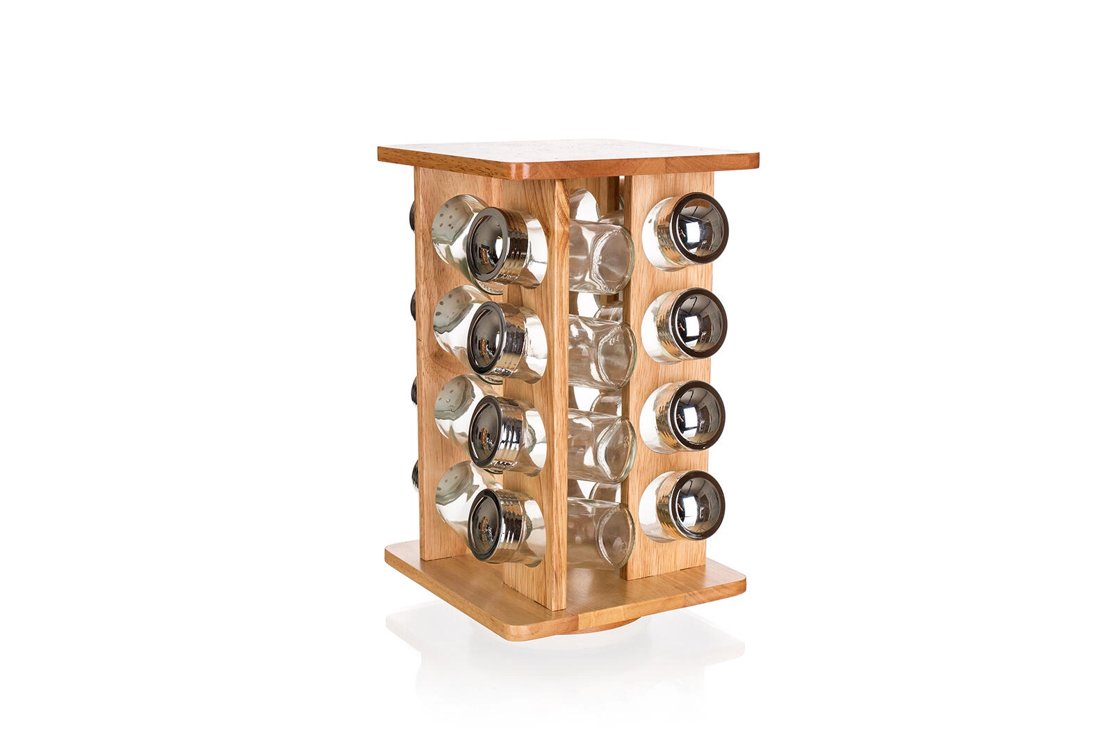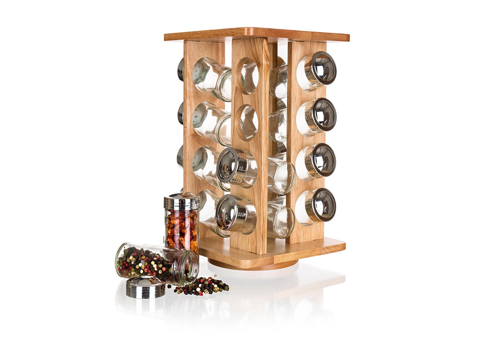 Elegantni set začimb z vrtljivim stojalom iz naravnega kavčukovca prinaša pregledno shranjevanje do 16 vrst začimb. Stekleni kozarčki s plastičnim pokrovčkom in kromirano obdelavo zagotavljajo preprosto doziranje, odličen pregled nad vsebino in čist dizajn za vsako kuhinjo. Vrtljiva konstrukcija prihrani prostor in omogoča hiter dostop do vseh začimb.