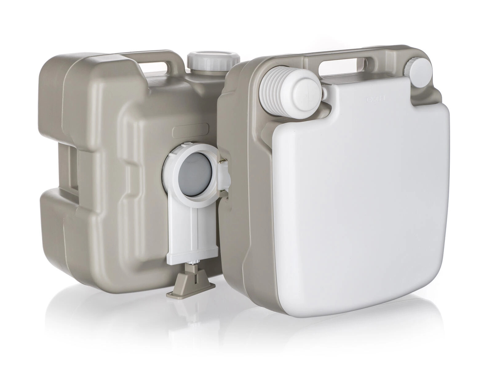 Odtočni rezervoar s prostornino 20 l in ločen 14 l rezervoar za čisto vodo zagotavljata zadostno kapaciteto za večdnevno uporabo. Trpežen material HDPE je zasnovan za dolgo življenjsko dobo v zahtevnih razmerah, medtem ko nova ojačana konstrukcija dna zmanjšuje tveganje poškodb pri pogostem prenašanju. Priložen je lijak za udobno dolivanje kemičnih sredstev.