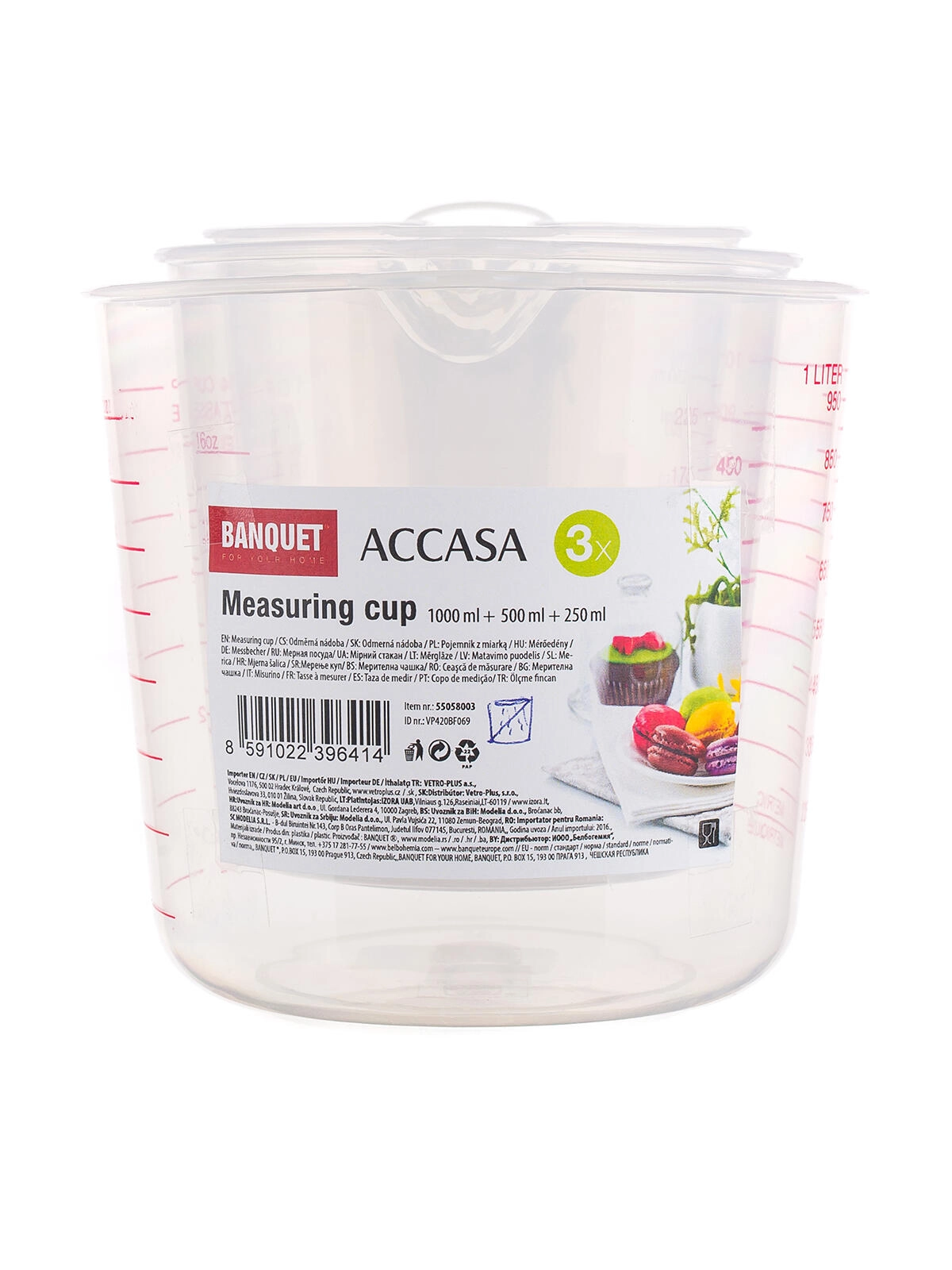 Set merilnih lončkov ACCASA omogoča natančno merjenje tekočin in suhih sestavin v kuhinji. Tri praktične prostornine 0,25 l, 0,5 l in 1 l pokrijejo vsakodnevno kuhanje in peko. Prozoren plast z rdečimi, dobro berljivimi črticami v mililitrih in unčah olajša nadzor količine z vsakega kota.