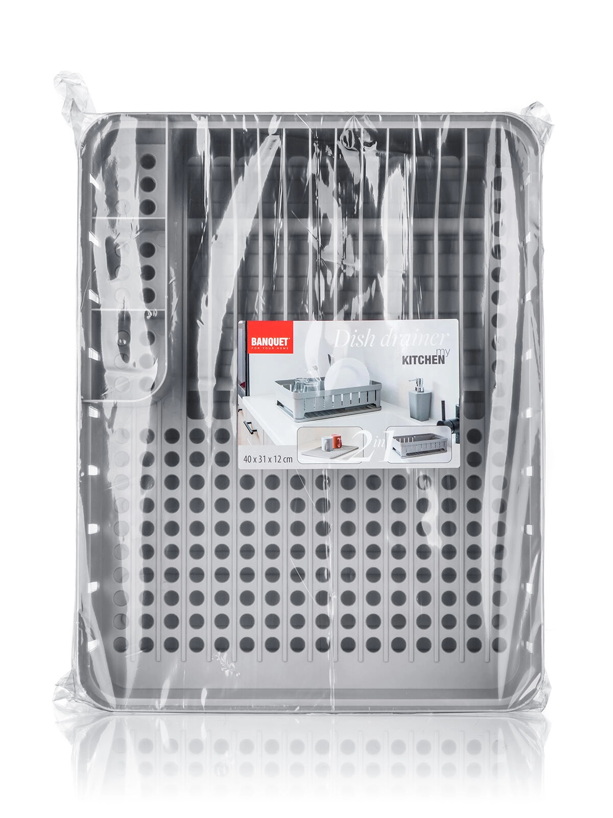 Praktičen odkapnik za posodo s pladnjem v sivi barvi meri 40 × 31 × 12 cm in zagotavlja dovolj prostora za vsakodnevno pomivanje. Ima ločene odseke za jedilni pribor, krožnike in drugo posodo, kar omogoča pregledno in hitro sušenje. Vzdržljiva plastika se enostavno čisti, pladenj pa zadržuje odvečno vodo, da delovna površina v kuhinji ostane čista in suha.