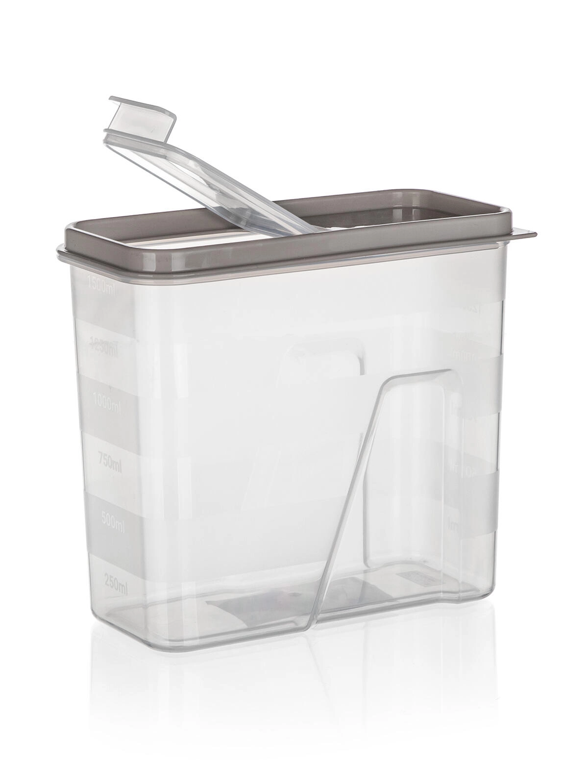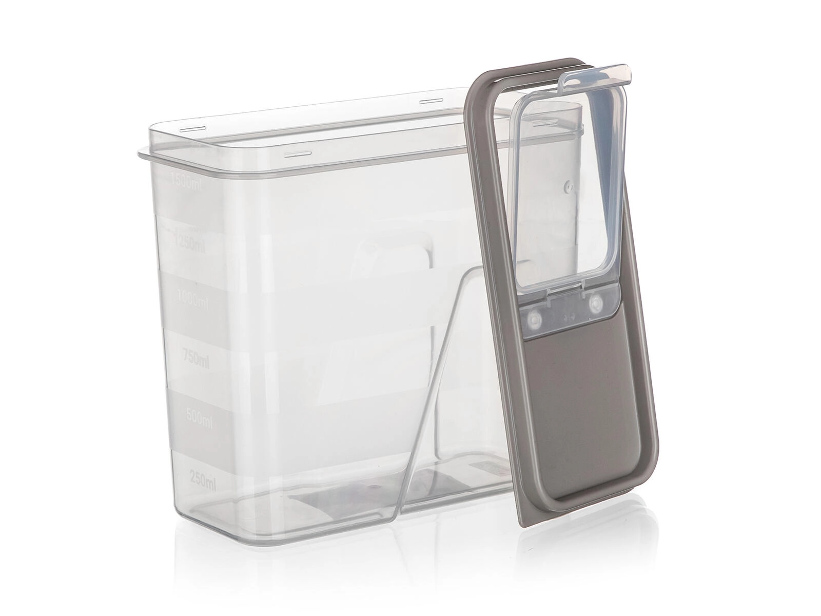 Praktična prozorna posoda s prostornino 1,5 l in elegantnim pokrovom v odtenku latte za pregledno in higiensko shranjevanje živil. Zahvaljujoč integrirani merilni lestvici in pametnemu odpirajočemu pokrovu boste zlahka odmerili in vsipali moko, testenine, stročnice ali kosmiče. Hermetično zapiranje pomaga ohranjati svežino, prozorne stene pa omogočajo takojšen pregled nad vsebino.