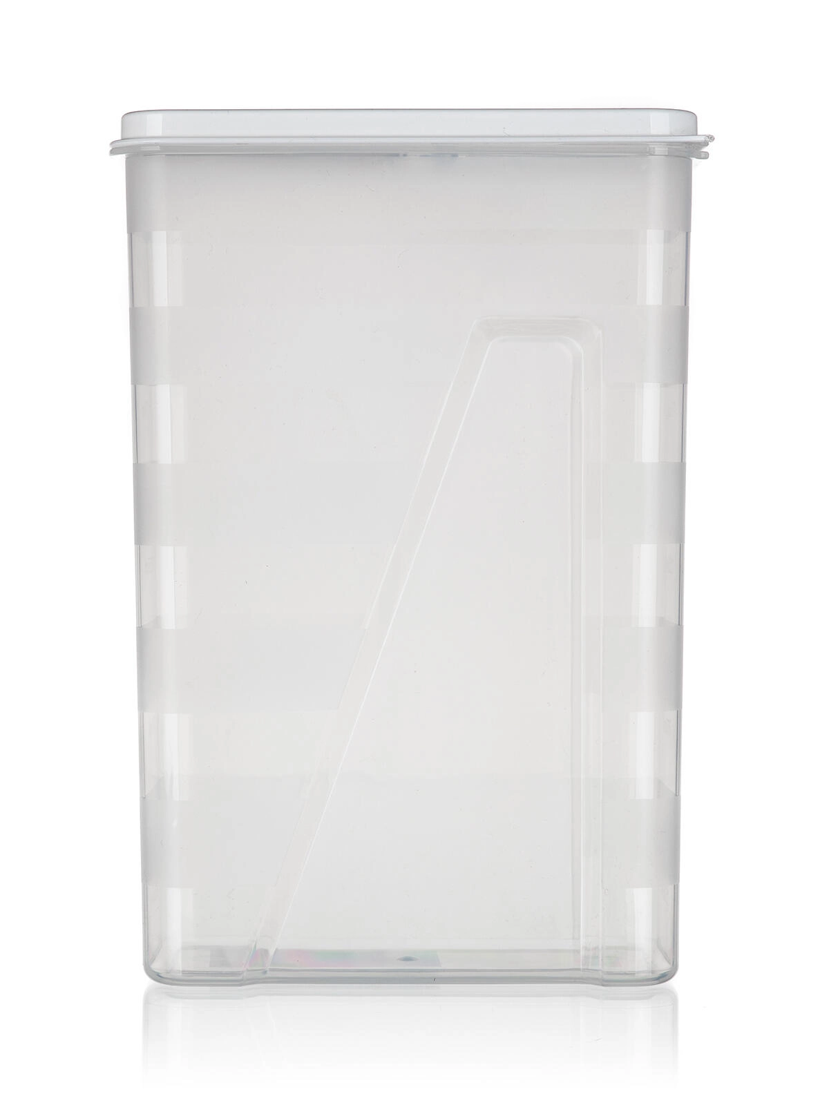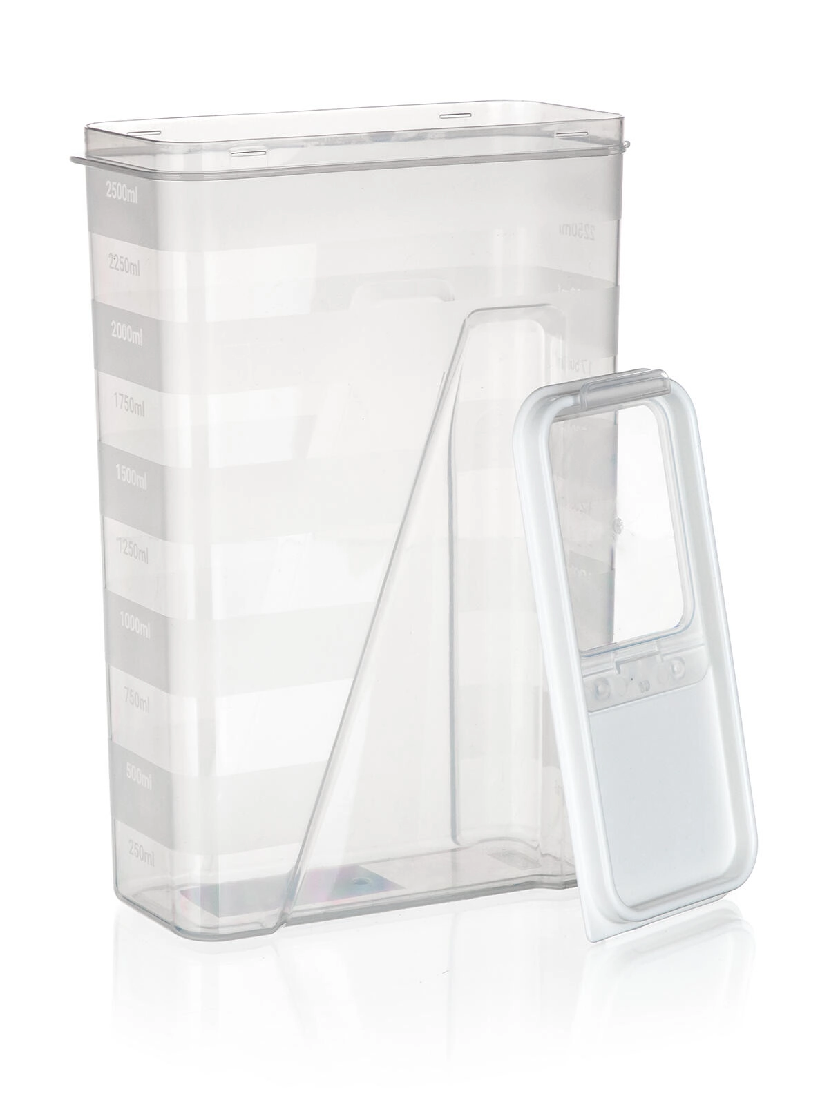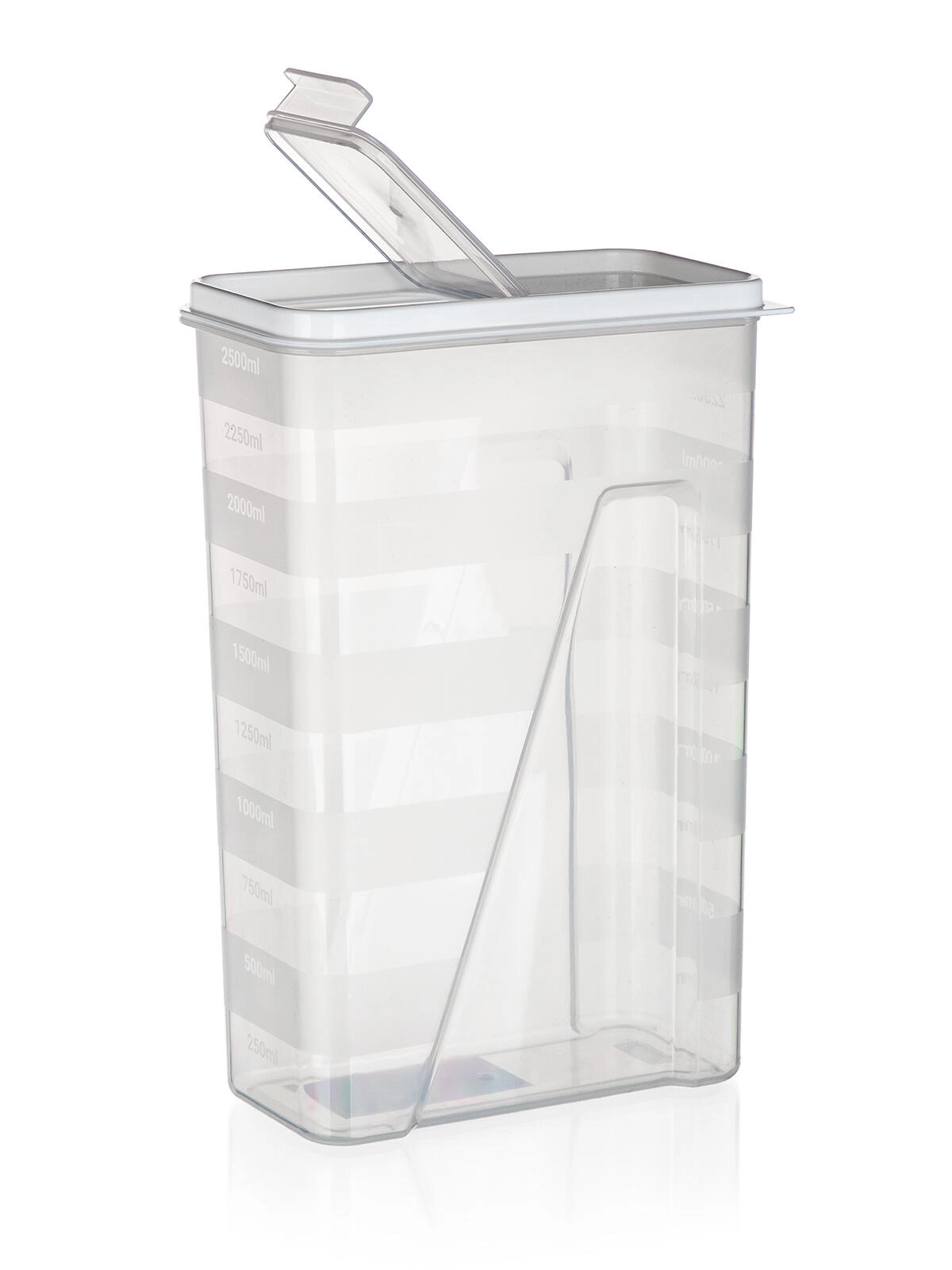 Praktična kuhinjska posoda s prostornino 2,5 l z odpirnim dozirnim pokrovčkom za enostavno posipanje in natančno odmerjanje. Prozorno ohišje omogoča takojšen pregled nad vsebino, tesnilni pokrov v beli barvi pa pomaga ohranjati živila dlje časa sveža. Idealna za testenine, stročnice, moko, riž ali žita, z merilno lestvico na 250 ml za udobno porcioniranje.
