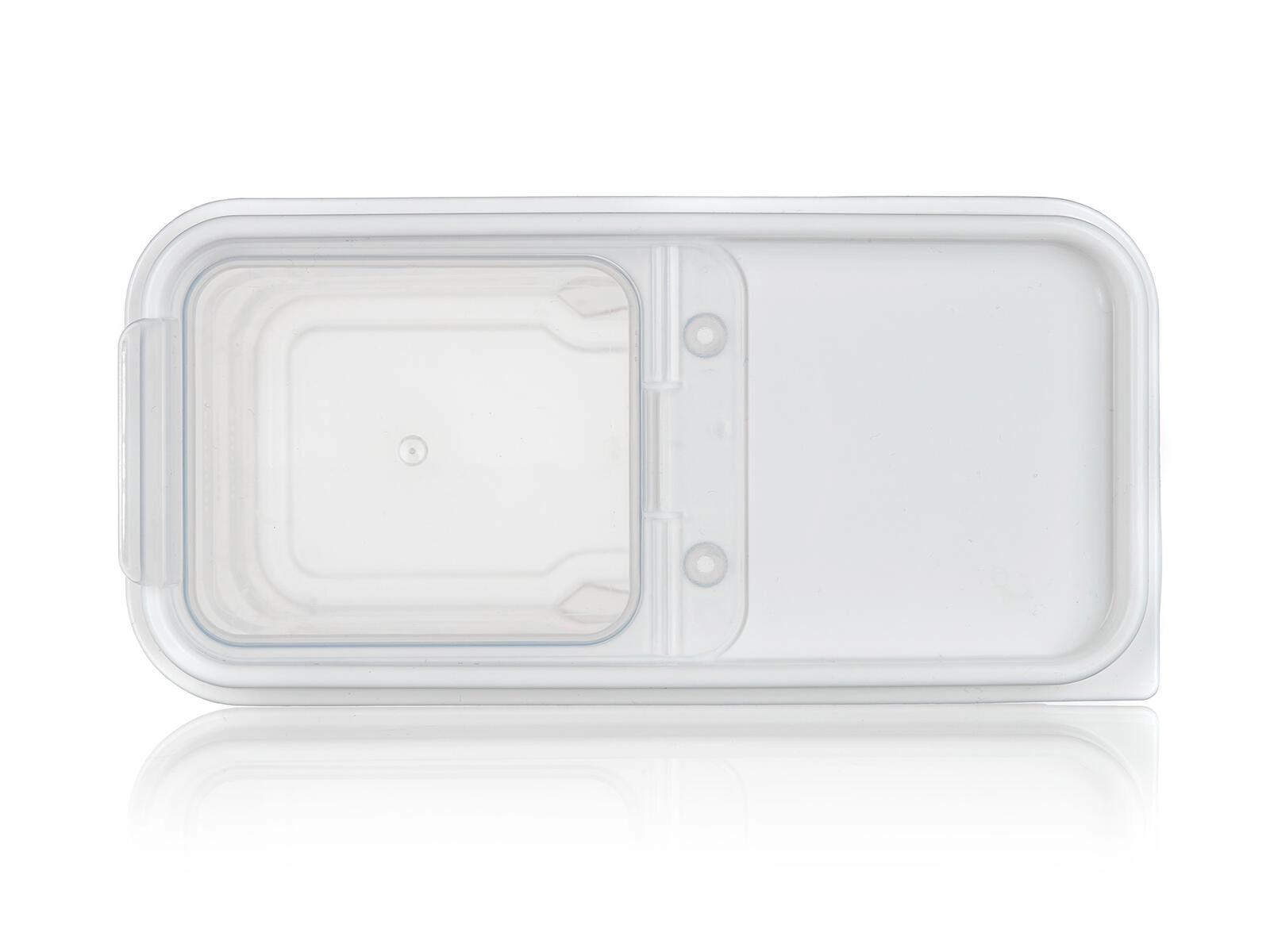 Prosojen material omogoča takojšen vizualni pregled vsebine. Oblika z oprijemom zagotavlja zanesljiv prijem in enostavno rokovanje.