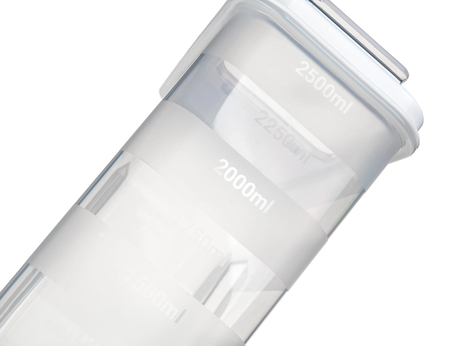 Vgrajena merilna lestvica s korakom 250 ml olajša nadzor količine in porcij. Čvrst, dobro tesneč pokrov pomaga ohranjati svežino in ščiti vsebino pred vlago. Posoda je idealna za vsakodnevno uporabo v kuhinji – za moko, sladkor, riž, oreščke, testenine ali žita.